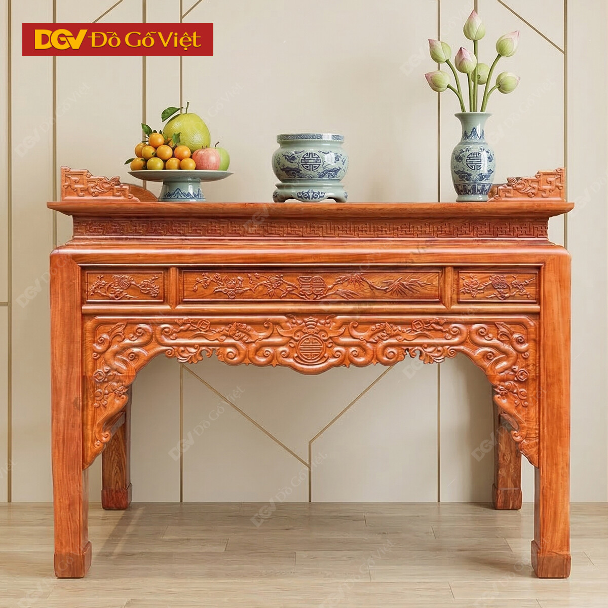 Án Gian Thờ Gỗ Hương Đá 1m53 Chạm Sen Kèm Bàn Cúng