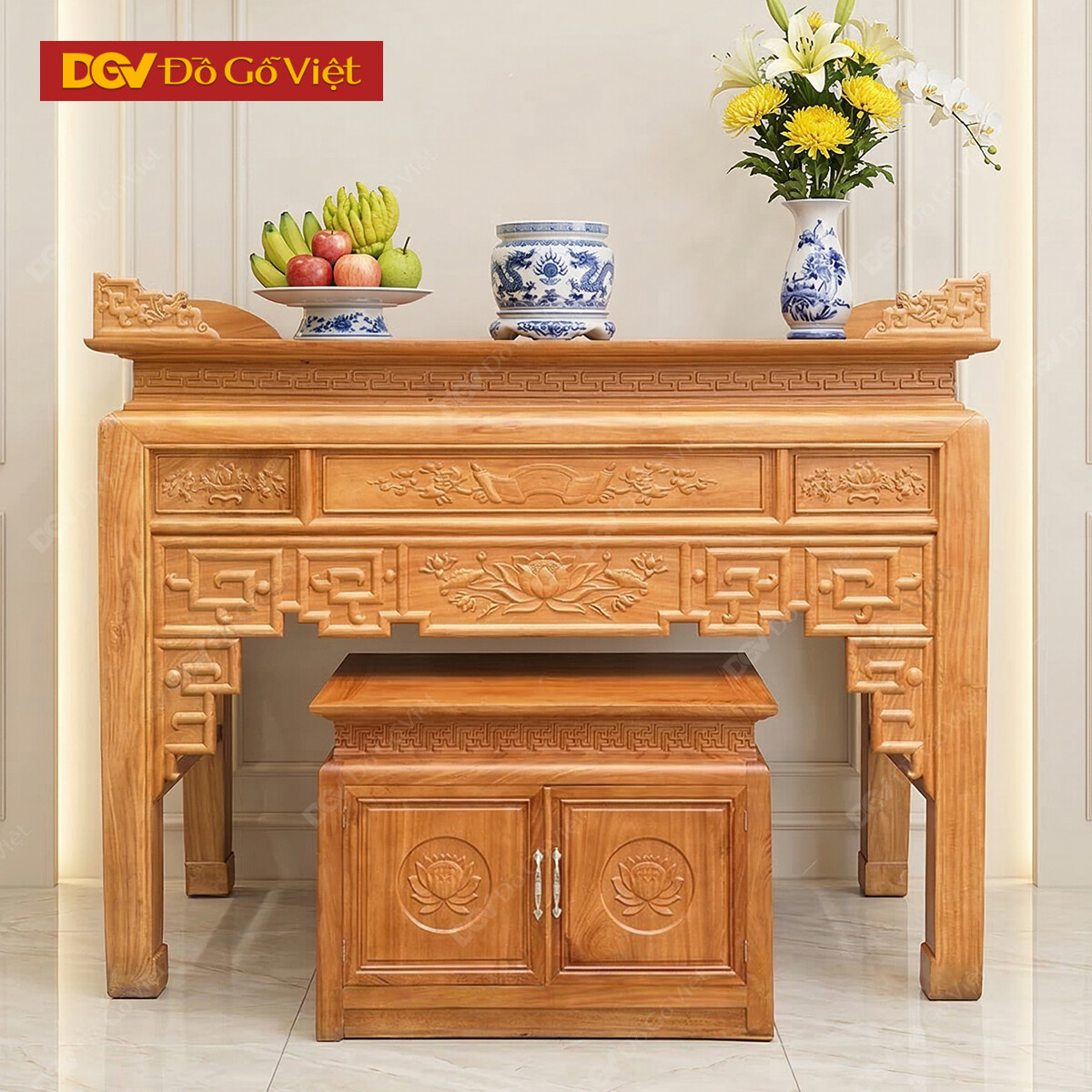 Án Gian Thờ Gỗ Gõ Đỏ 1m27 Mẫu Chạm Sen Cao Cấp