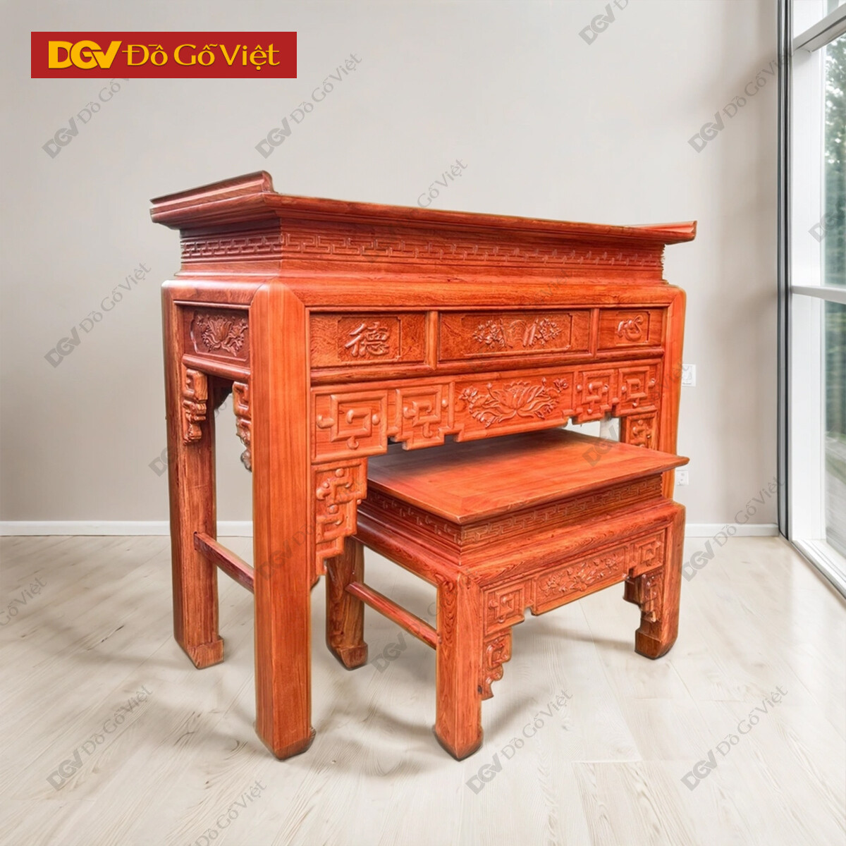 Án Gian Thờ 1m53 Gỗ Hương Đá Chạm Sen Kèm Tủ Táp