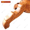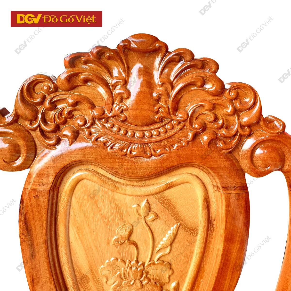 • Ghế ngồi thiết kế kiểu cổ điển với phần vai bo cong mềm mại, lưng ghế chạm họa tiết hoa sen nở trang nhã. Đỉnh ghế chạm hoa lan tây cuộn tròn nhô cao tinh xảo. Các họa tiết được chạm nổi ấn tượng tạo nên vẻ đẹp sắc sảo cho từng hoa văn trang trí. Chân ghế thiết kế dạng chân quỳ chạm hoa tây độc đáo, 2 chân trước hơi cong nhẹ theo kiểu cổ điển khá đẹp mắt.