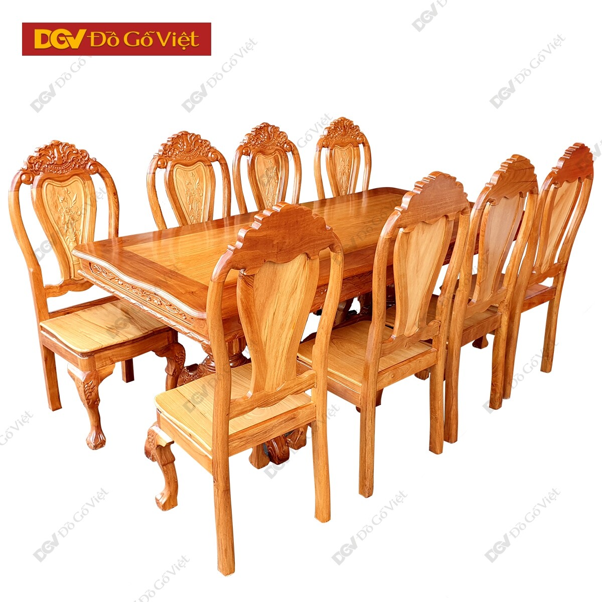 Bàn Ăn Căm Xe Mặt Gõ Chữ Nhật Cong 1m9 8 Ghế Chất Lượng Cao