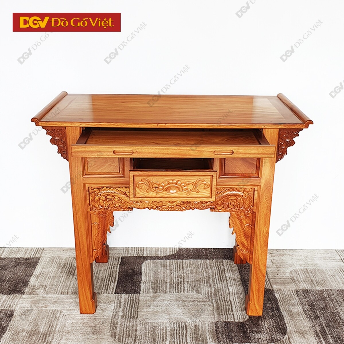 Mặt bàn thờ làm từ gỗ nguyên tấm dày 2.5cm rắn chắc và chịu lực tốt. Cùng với đó là tựa lưng và vách ngăn hai bên đảm bảo các vật dụng thờ cúng không bị rơi vỡ, hư hỏng khi có va chạm.