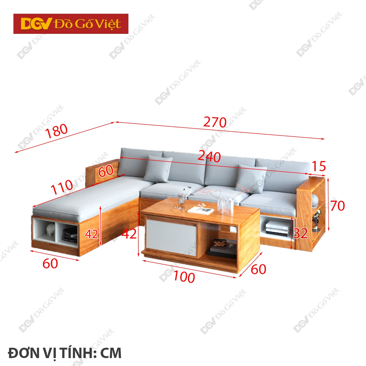 • Góc L nối dài: Dài 110cm x Rộng (lọt lòng) 60cm x Cao 32cm không nệm/Cao 42cm cả nệm.