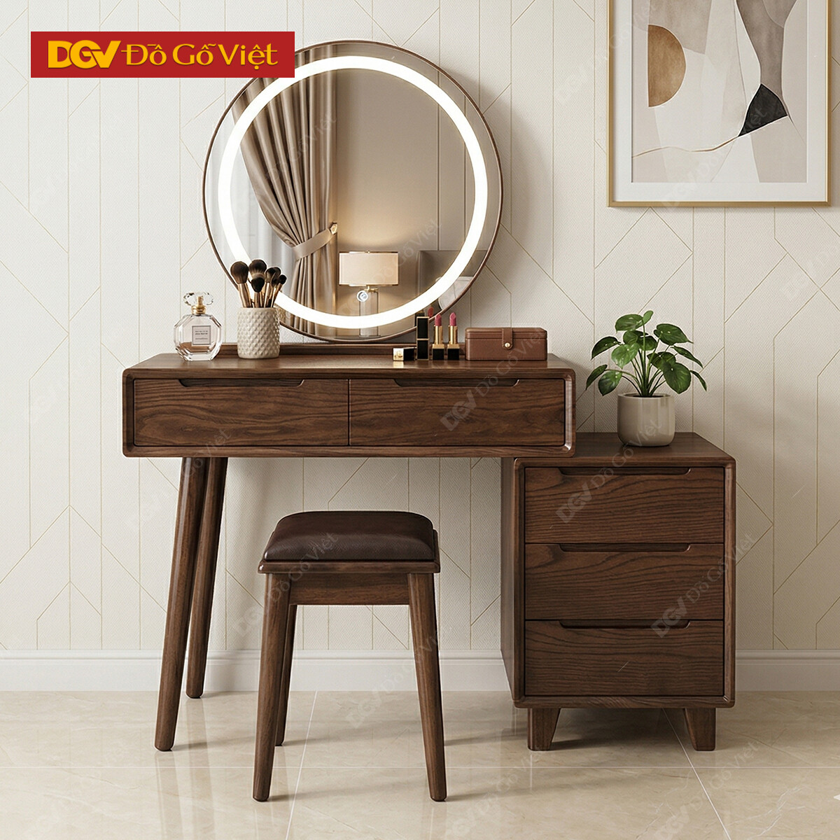 Bàn Phấn Gỗ Sồi Màu Nâu Óc Chó Gương Led Tròn Đẹp Mắt