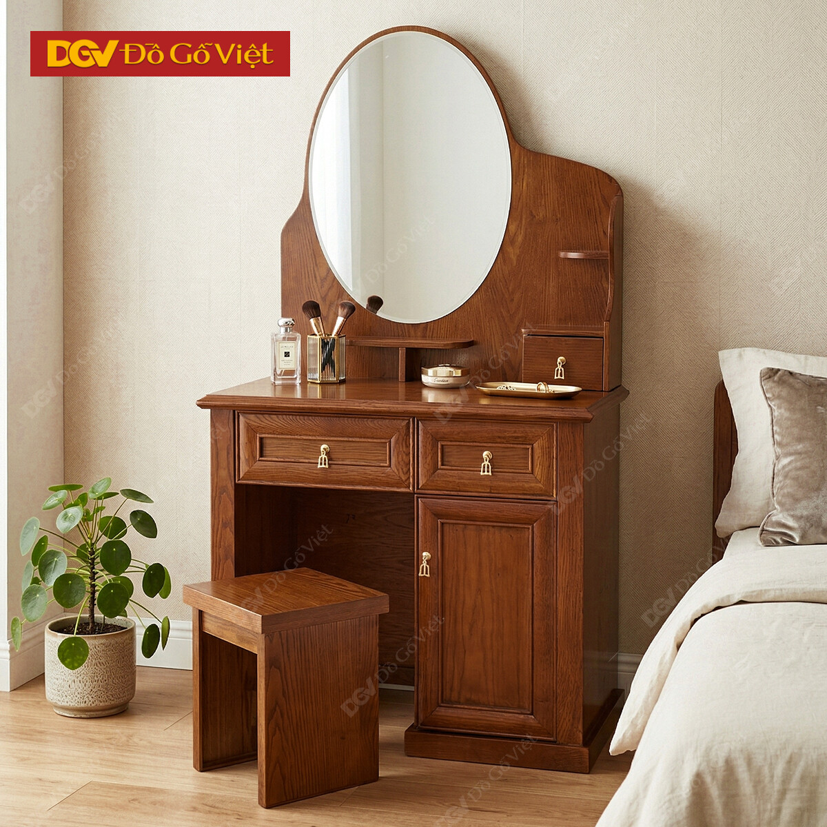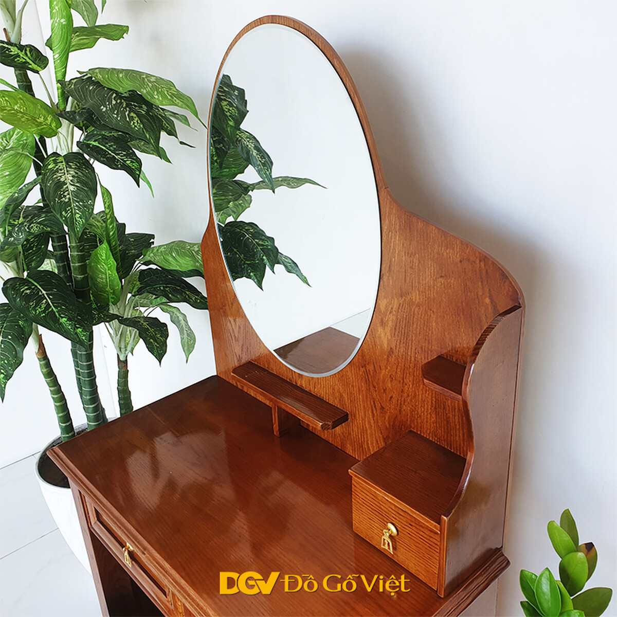 • Tầng trên bàn trang điểm sồi gồm 1 mặt gương soi oval được thiết kế theo kiểu tràn viền giúp không gian trong gương được mở rộng hơn, vừa giúp người dùng dễ trang điểm vừa giúp mang tới sự rộng rãi cho căn phòng của bạn.