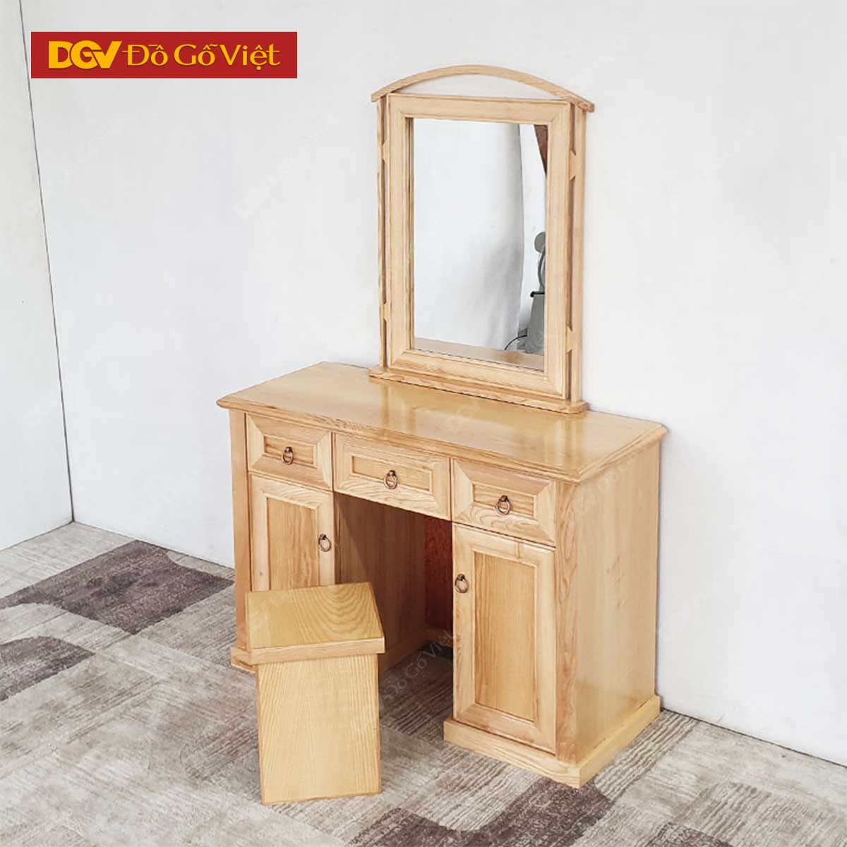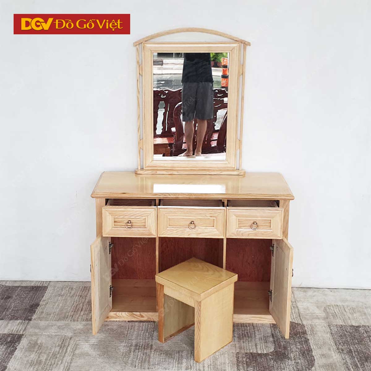 Bàn trang điểm chất liệu gỗ tự nhiên được thiết kế đối xứng với 3 hộc tủ ngang cùng hai ngăn tủ lớn ở hai bên vô cùng rộng rãi, bạn có thể thoải mái bảo quản, cất giữ mỹ phẩm, trang sức cũng như túi xách … ở đây.