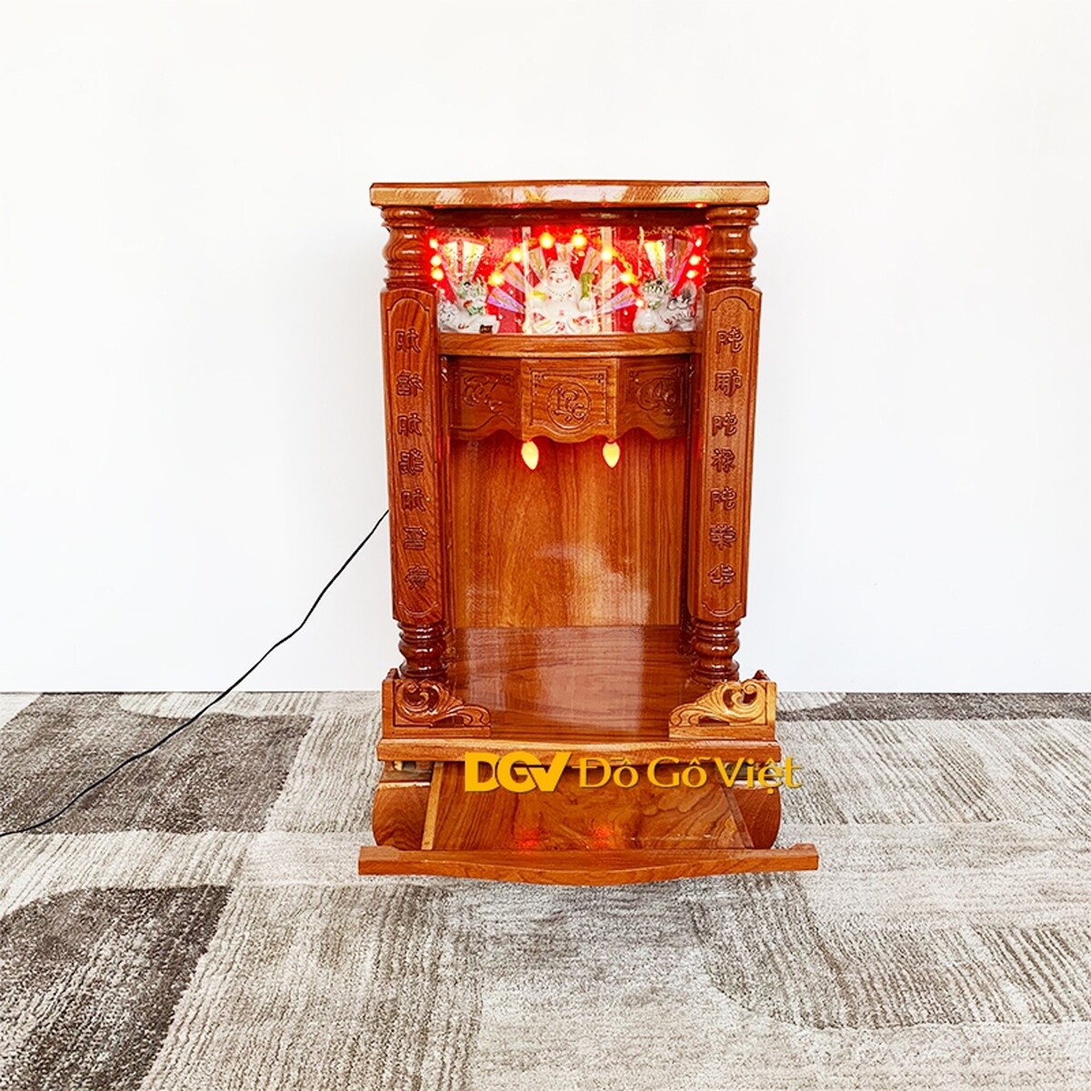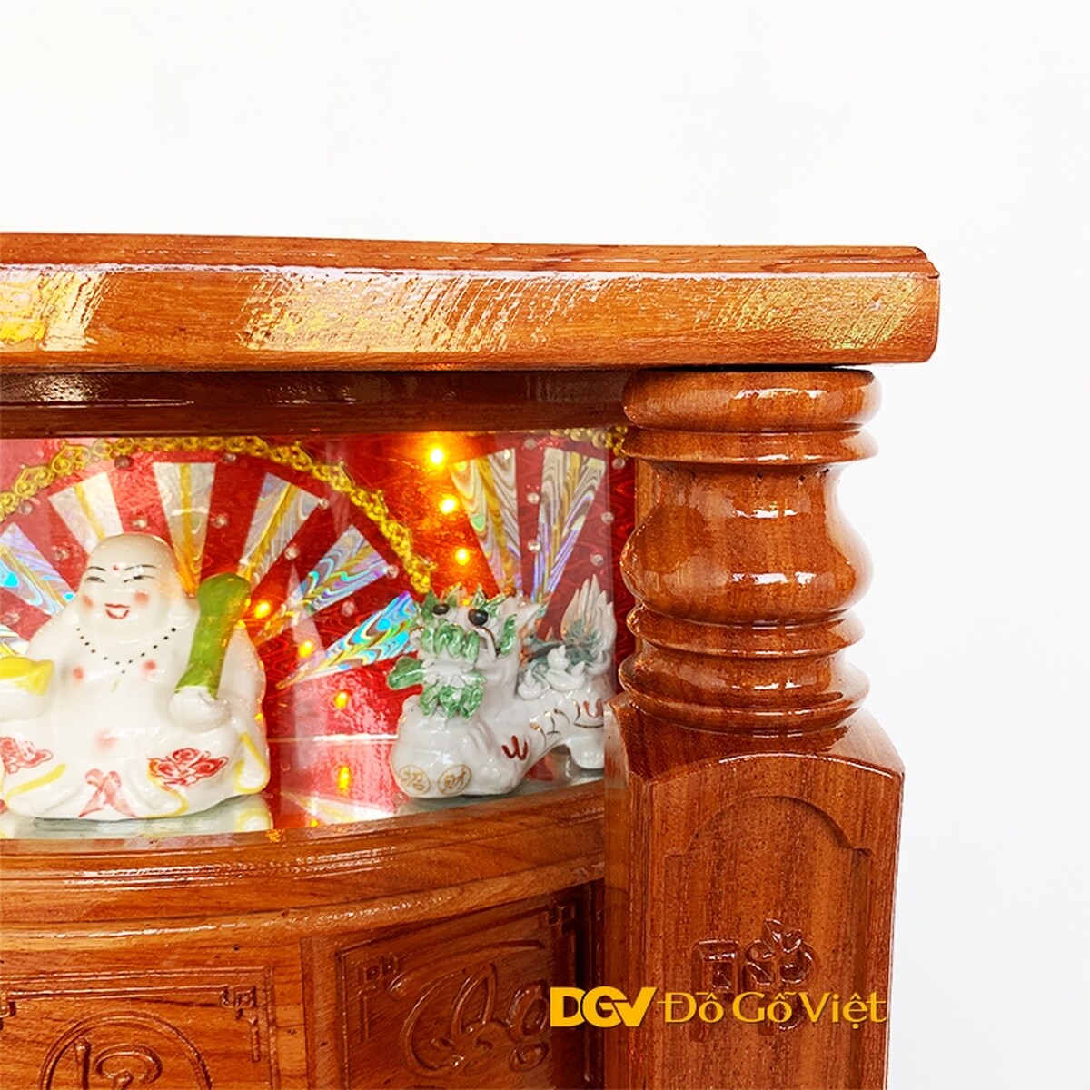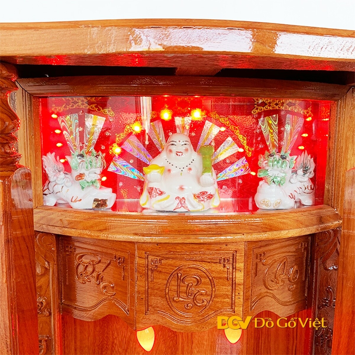 Bên trên cùng là tượng phật di lặc cùng hai linh vật kỳ lân quản lý, ngăn chặn những điều sai trái của các vị thần đồng thời ngăn ngừa xua đuổi tà ma, bảo vệ sự bình an cho các thành viên trong gia đình. Phía sau tượng được gắn đèn LED đổi màu tạo thêm nét độc đáo cho sản phẩm.