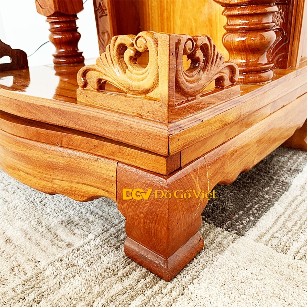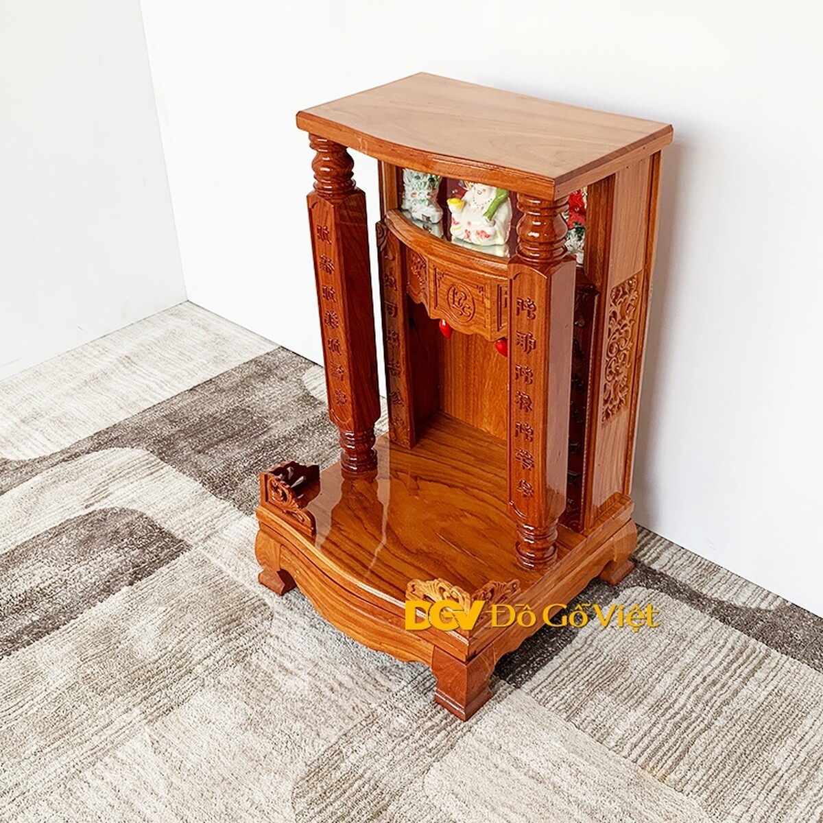 Để phù hợp với nhu cầu sử dụng hiện nay của các gia chủ có không gian sống vừa và nhỏ, sản phẩm sở hữu kích thước nhỏ, được thiết kế theo tạo hình đơn giản, không quá cầu kỳ với các góc cạnh vững chãi, xen lẫn là các họa tiết truyền thống được chạm trổ khéo léo tạo nên vẻ đẹp hài hòa, tinh tế.