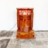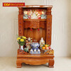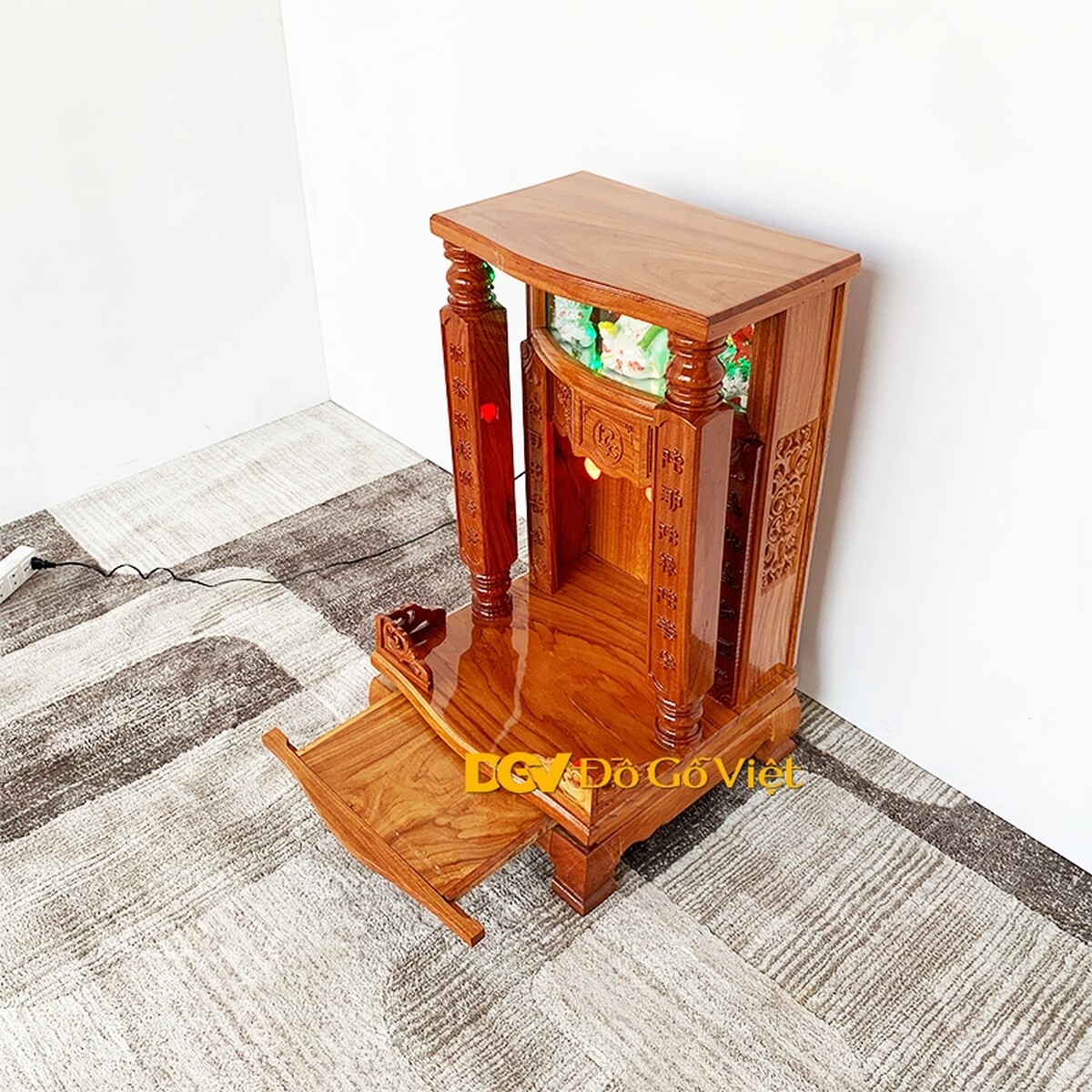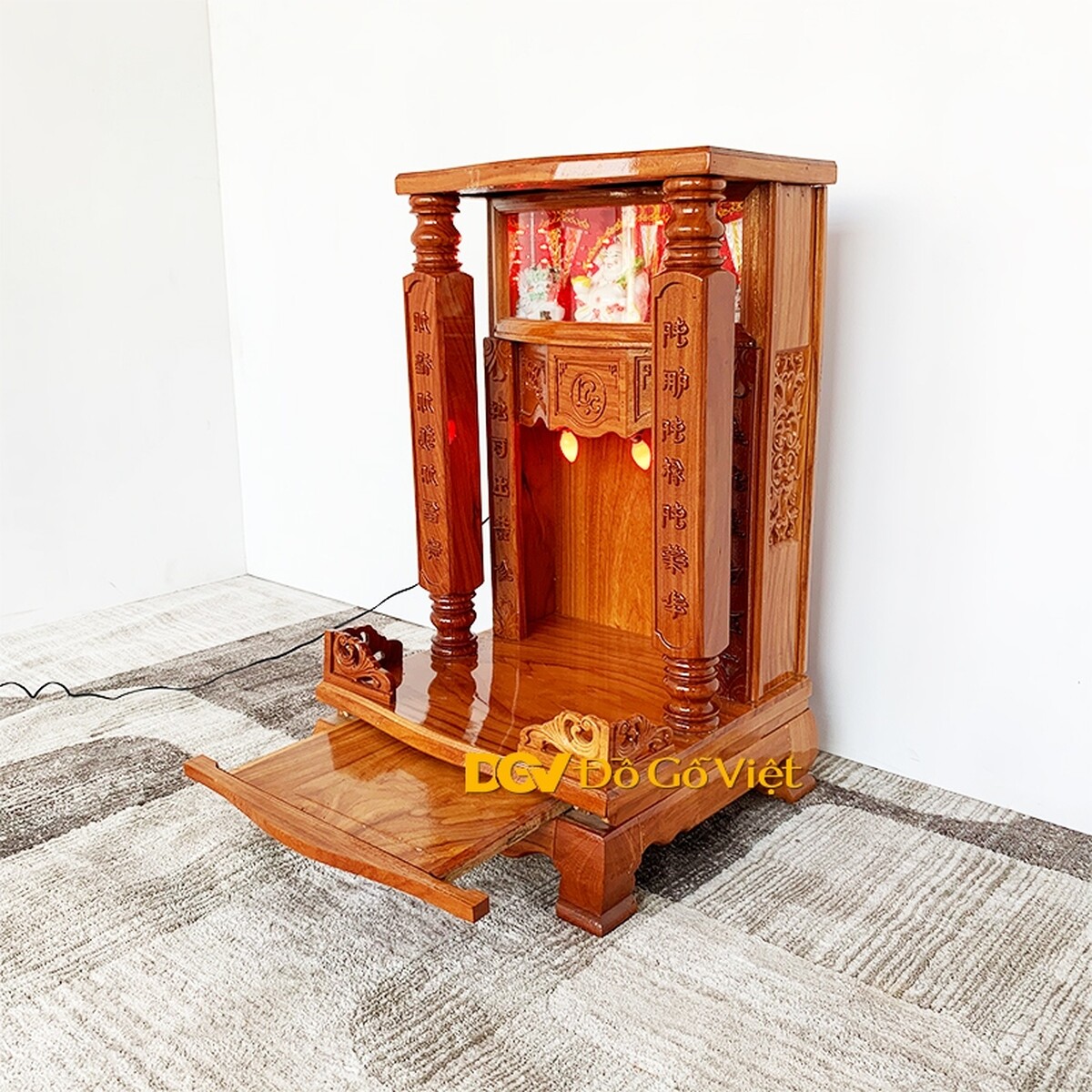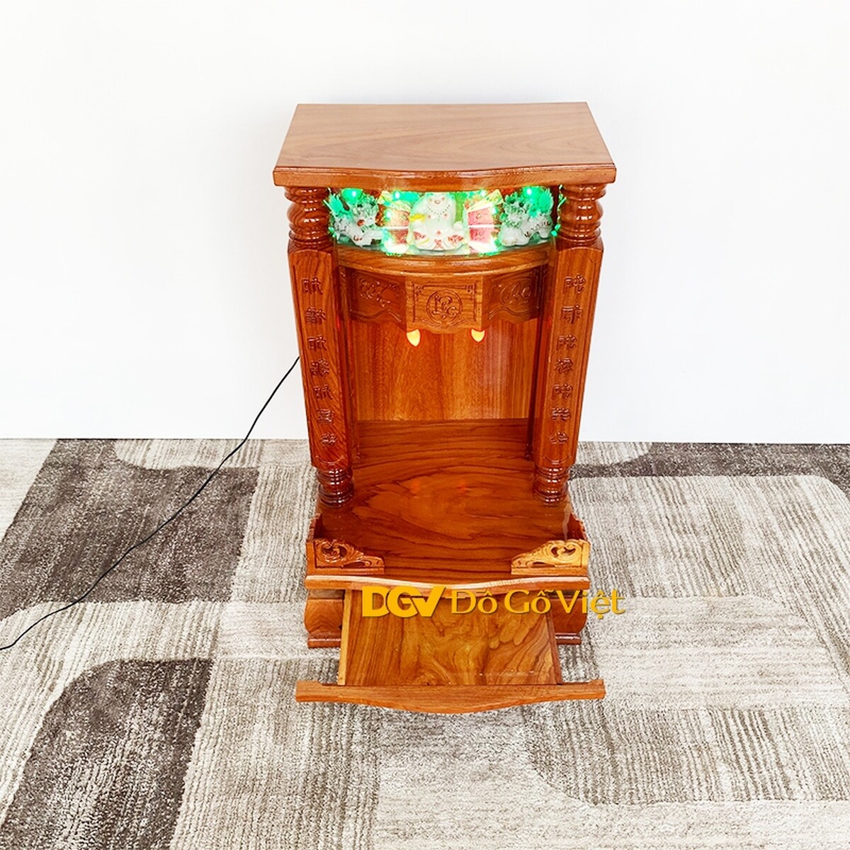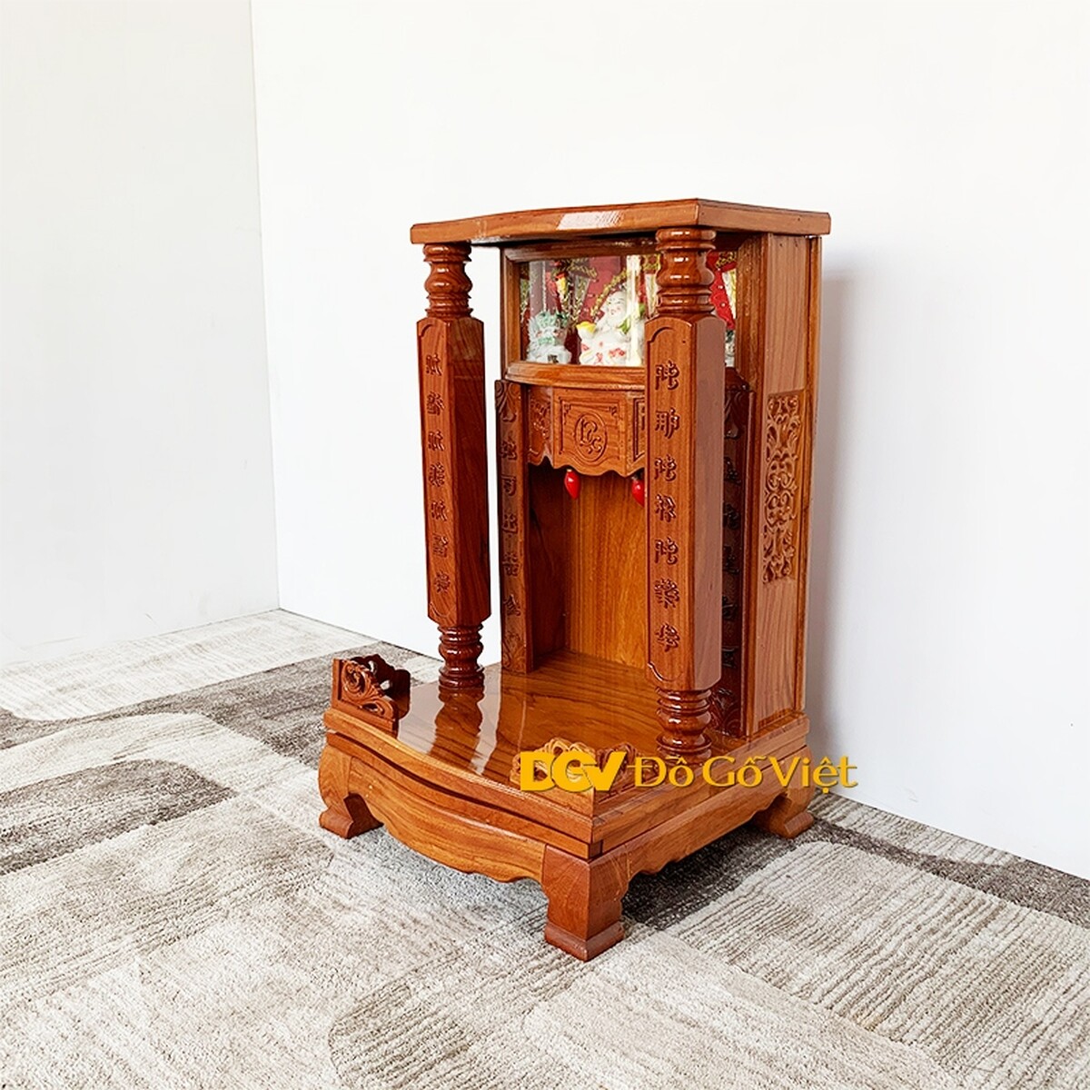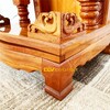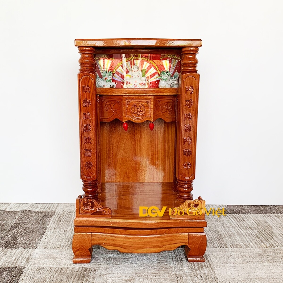 Bàn thờ ông địa gõ đỏ giá rẻ có kiểu dáng mái bằng với hai cột đình được tiện hình trụ vuông vức. Bên trong ở trung tâm là hoa văn Phúc - Lộc - Thọ mang ý nghĩa may mắn, đầm ấm, tài lộc đầy nhà cũng tuổi thọ lâu dài cho gia chủ.