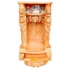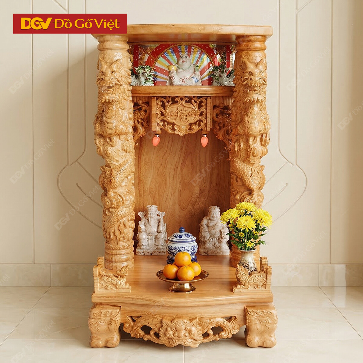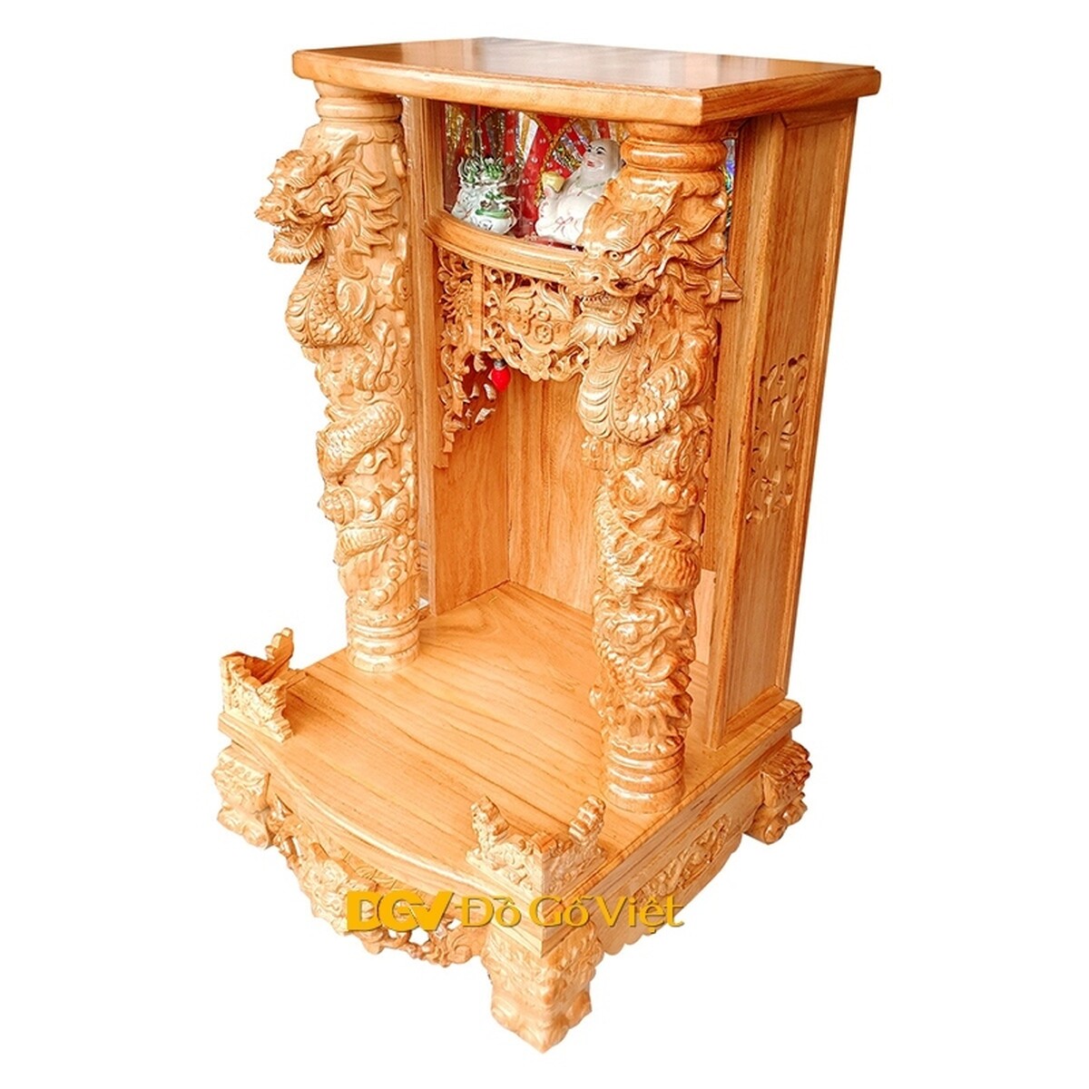 Mẫu bàn thờ thần tài gõ đỏ này được thiết kế theo dạng mái bằng nhằm tiết kiệm diện tích trưng bày hơn so với những bàn thờ mái nghiêng khác. Mặt trước bàn thờ được chạm trổ cầu kỳ theo phong cách cổ điển với nhiều hoa văn mang ý nghĩa phong thủy tốt đẹp. Hai cột trụ lớn được đục khắc rồng cuốn với mặt rồng chính diện sống động, oai phong.