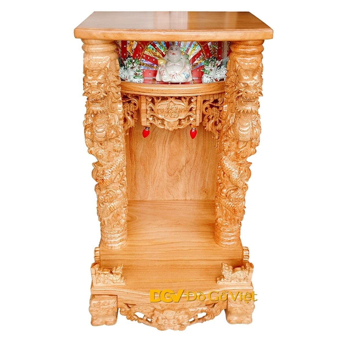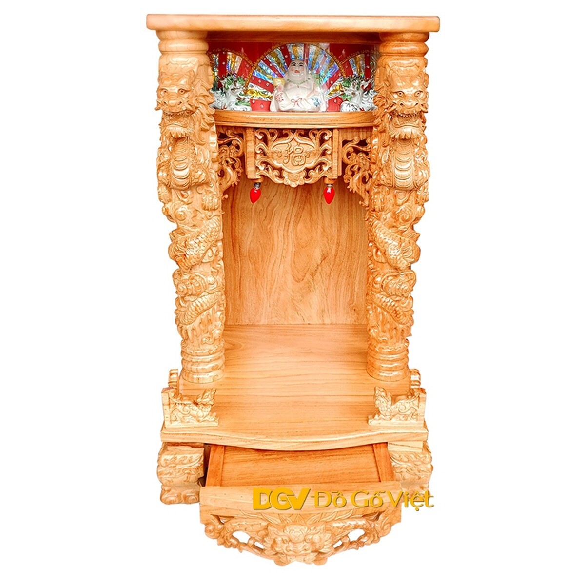 Bàn thờ được chế tác từ gỗ gõ đỏ già nhiều năm tuổi, các chi tiết như mặt bàn thờ, cột trụ, mái bằng, … đều được làm từ gỗ nguyên khối, nguyên tấm đảm bảo được chất lượng và độ bền cho sản phẩm.
