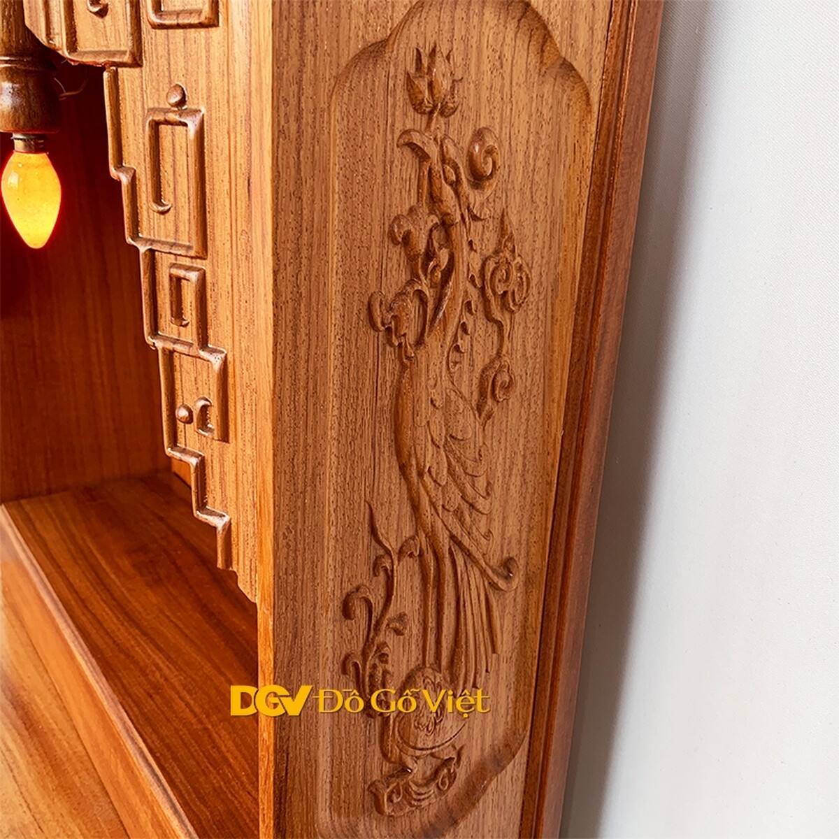 Sản phẩm còn được thiết kế với các họa tiết hoa lá đối xứng sống động tràn đầy linh khí tạo nên vẻ đẹp uyển chuyển giúp cân bằng với tạo hình khối hộp vuông vức của bàn thờ dễ dàng bày trí trong các không gian khác nhau.