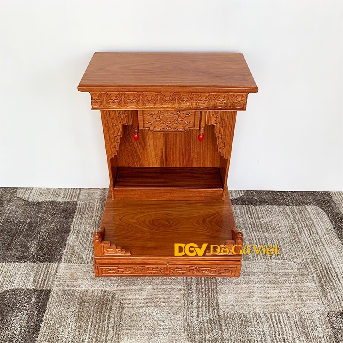 Mặt phía ngoài rộng và bằng phẳng như một sân đình, gia chủ có thể bày trí các vật phẩm như lọ hoa, chén nước, lư hương, mâm quả… Mép ngoài cùng ở hai phía là 2 cột trụ được điêu khắc tinh xảo càng tôn thêm sự độc đáo, mới lạ cho bàn thờ.