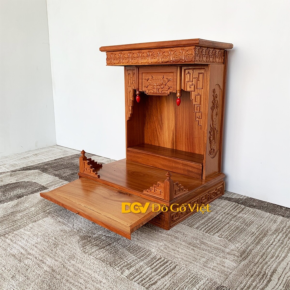 Để nâng cao sự tiện dụng của mình, sản phẩm còn được tích hợp một mâm thờ có thể kéo - đẩy nơi bạn có thể đặt hoa quả, chén “minh đường tụ thủy” hay các đồ vật khác thuận tiện cho việc thờ cúng.
