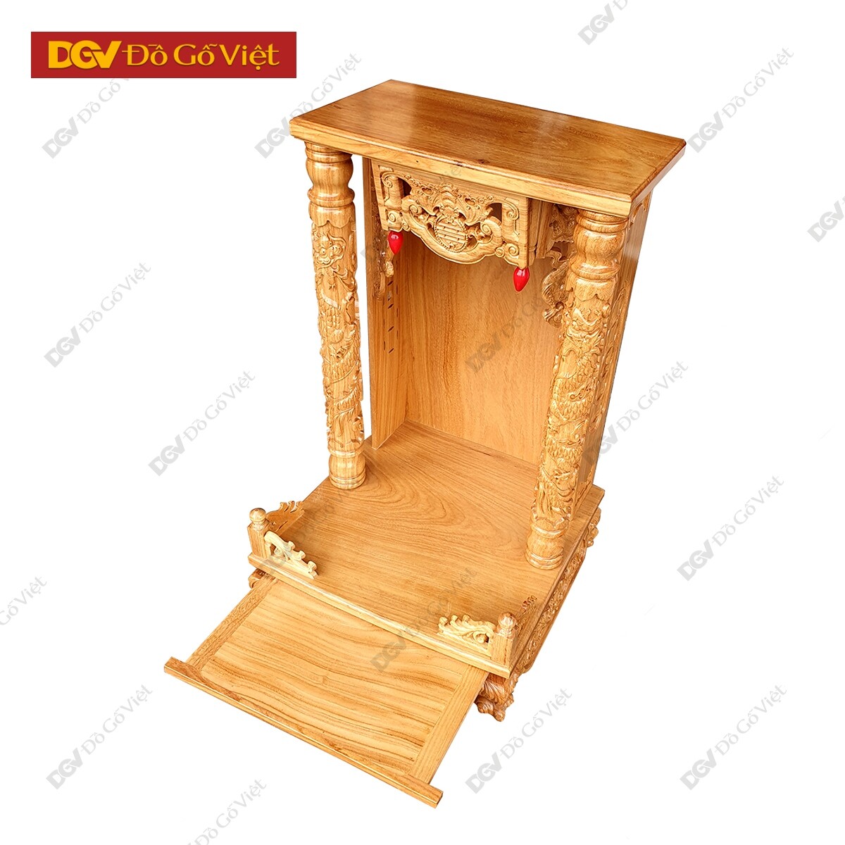 Khay thờ được thiết kế gồm 2 khay với 1 khay liền trên mặt và 1 khay âm phía dưới có thể kéo ra dễ dàng. Với kích thước bề mặt khoảng 50cm (khay trên), 40cm (khay dưới) đảm bảo không gian rộng rãi, bày trí được nhiều đồ thờ cúng mà không tốn quá nhiều diện tích phòng.