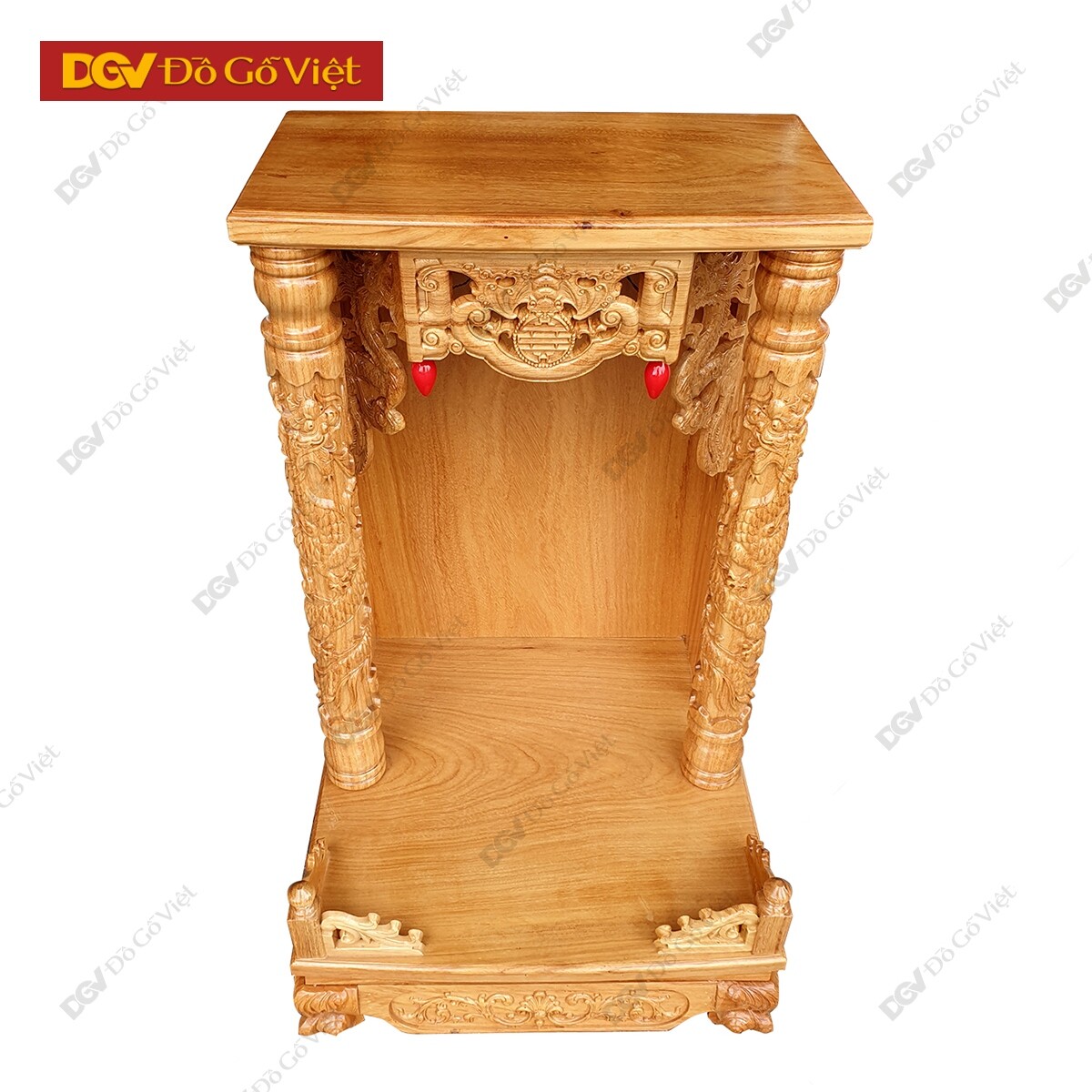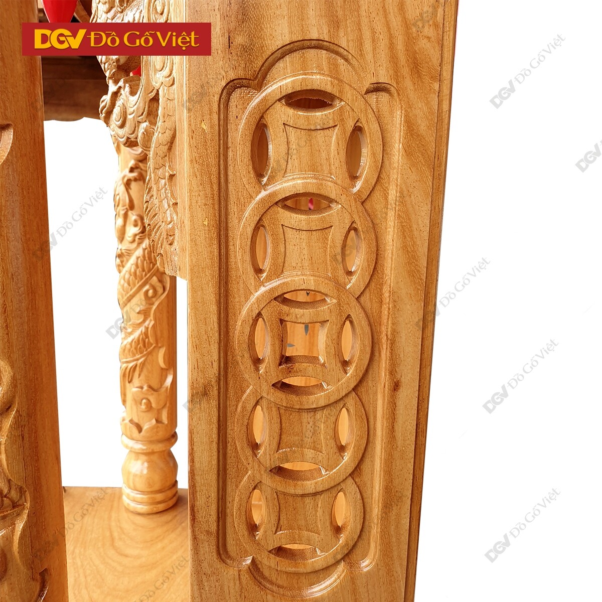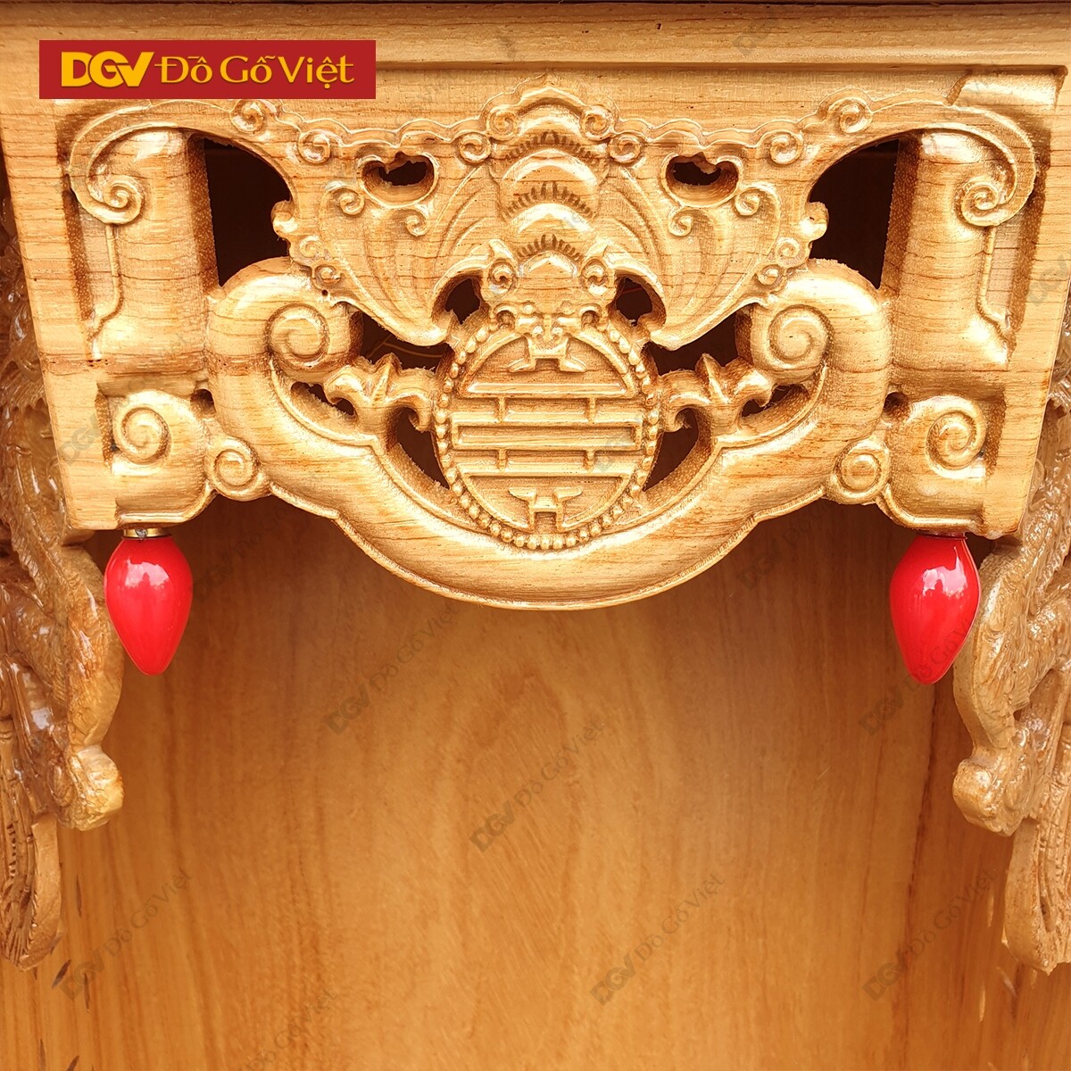 Mặt trước bàn thờ được chạm hình rơi ngũ phúc với mong muốn chiêu tài, cầu lộc, giúp gia chủ gặp được nhiều thuận lợi và may mắn trong công việc kinh doanh. Hai hình Rồng hai bên tượng trưng cho chính khí, sức mạnh của linh vật có tác dụng sát quỷ, trừ tà, loại bỏ nguồn năng lượng xấu để giữ được nguồn năng lượng tích cực cho không gian thờ phụng.