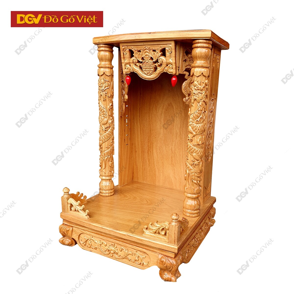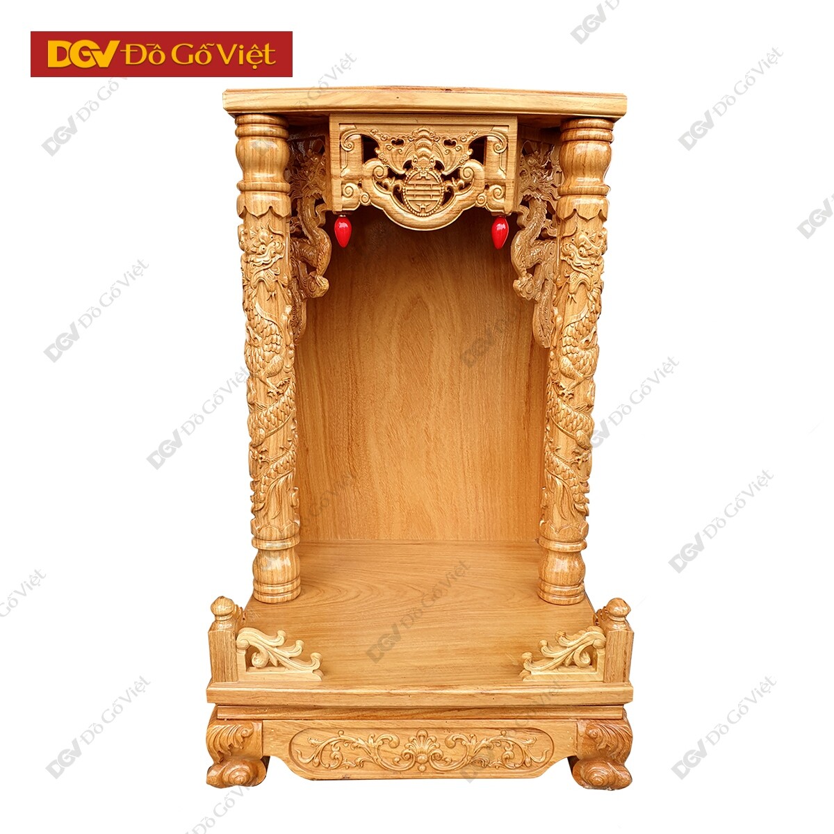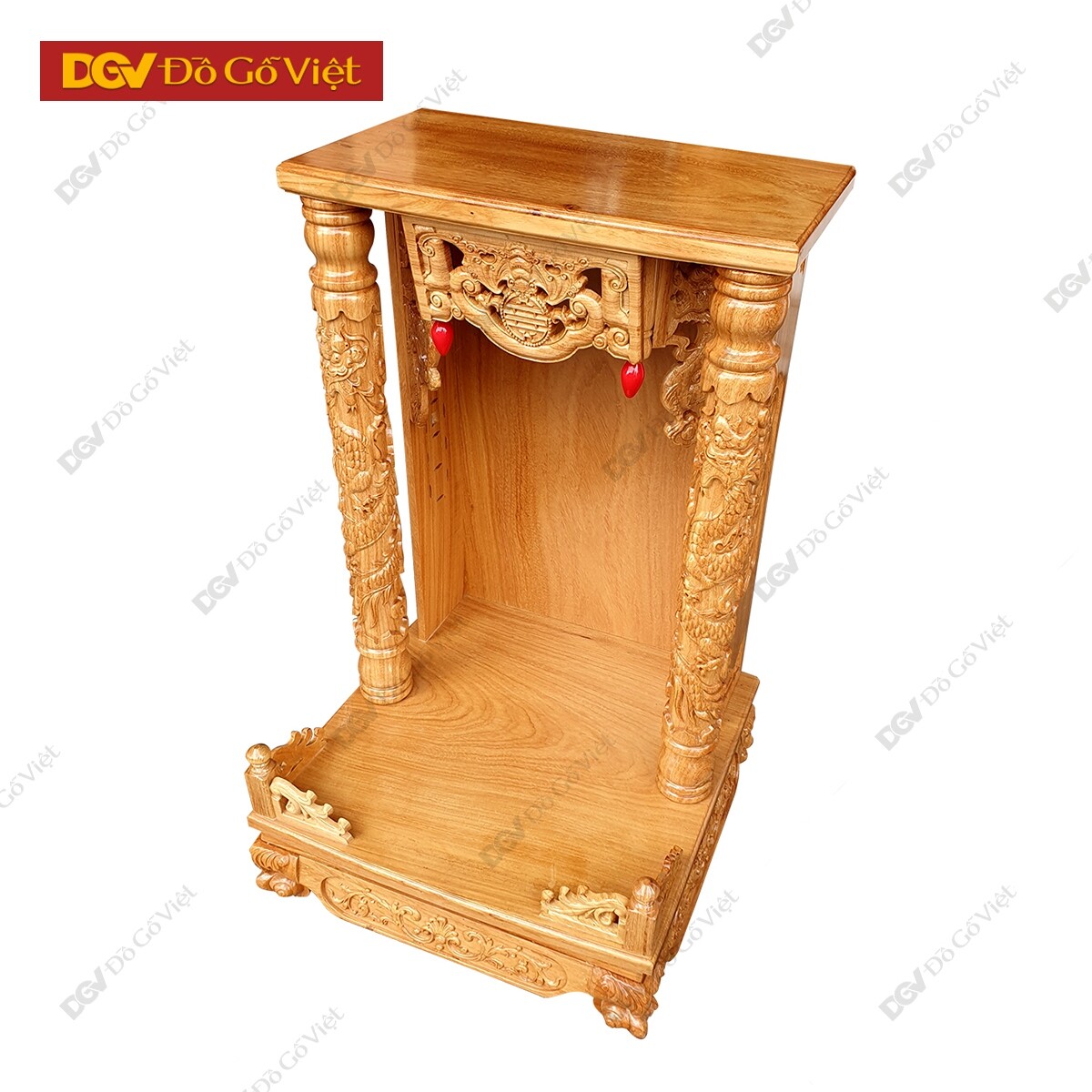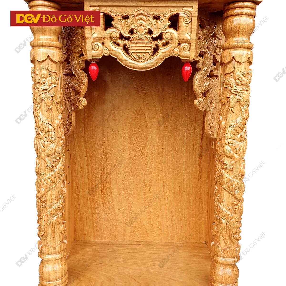 Mặt trước bàn thờ được chạm hình rơi ngũ phúc với mong muốn chiêu tài, cầu lộc, giúp gia chủ gặp được nhiều thuận lợi và may mắn trong công việc kinh doanh. Hai hình Rồng hai bên tượng trưng cho chính khí, sức mạnh của linh vật có tác dụng sát quỷ, trừ tà, loại bỏ nguồn năng lượng xấu để giữ được nguồn năng lượng tích cực cho không gian thờ phụng.