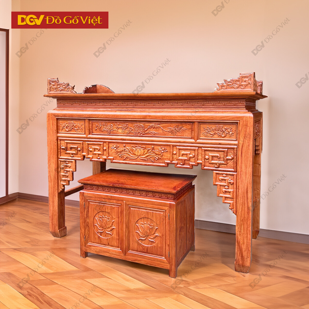 Án Gian Thờ 1m53 Gỗ Hương Đá Chạm Sen Kèm Tủ Táp