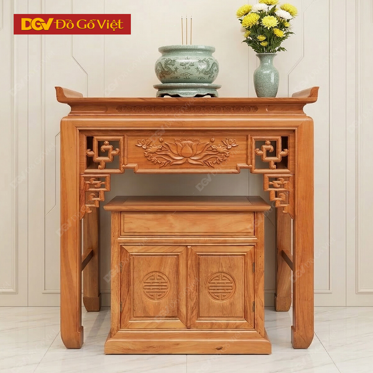 Án Gian Thờ Gỗ Gõ Đỏ 1m27 Mẫu Chạm Sen Cao Cấp