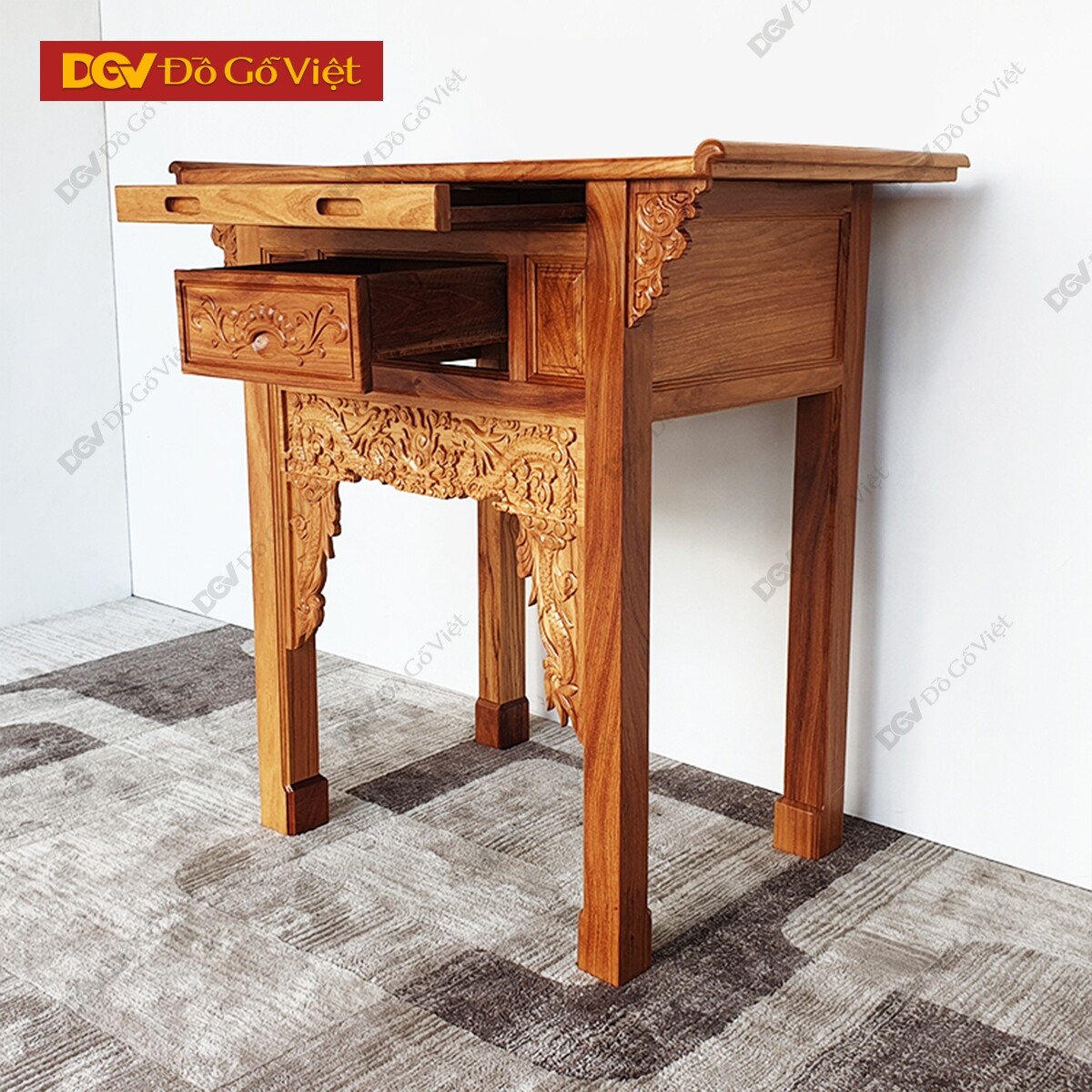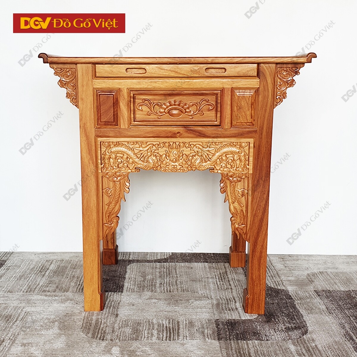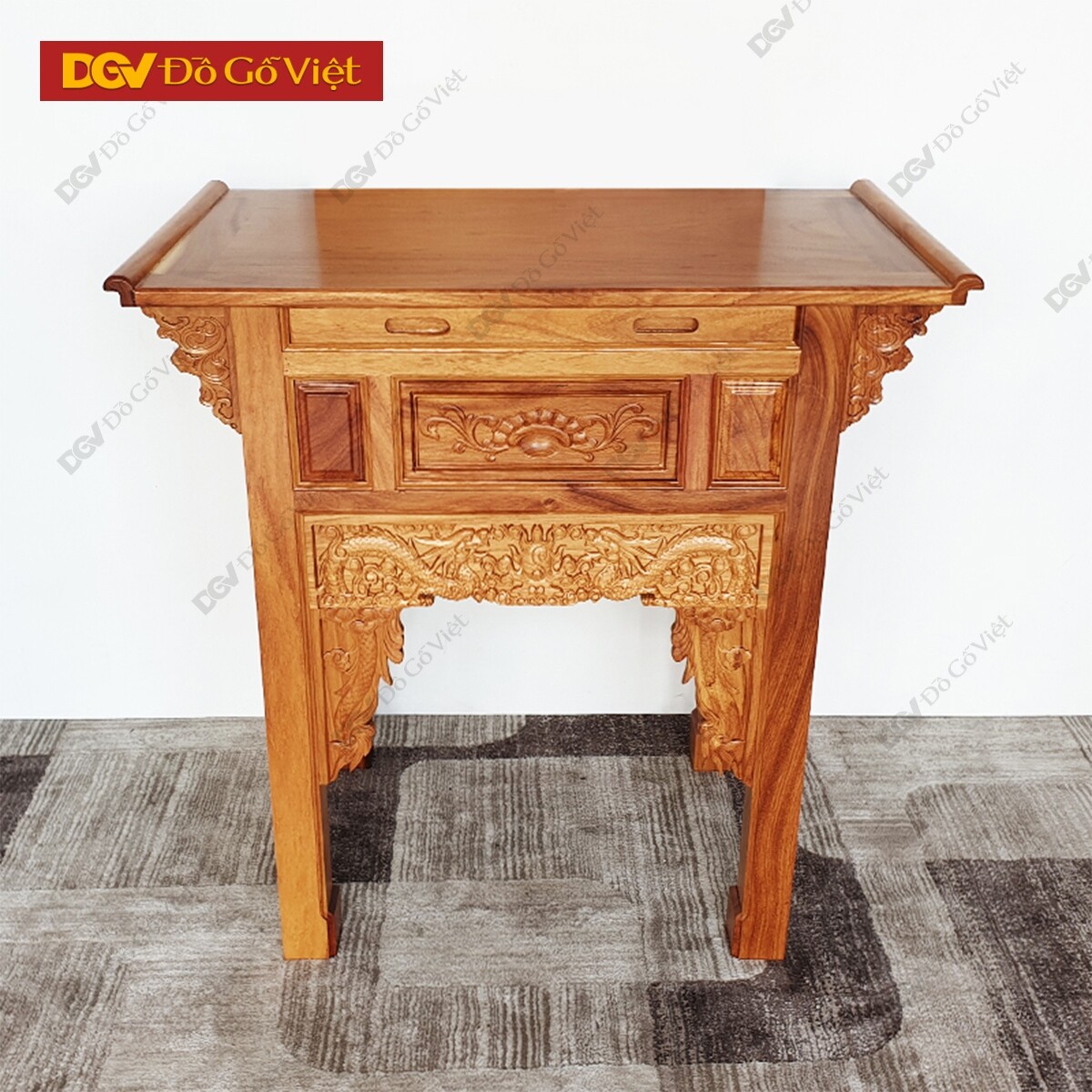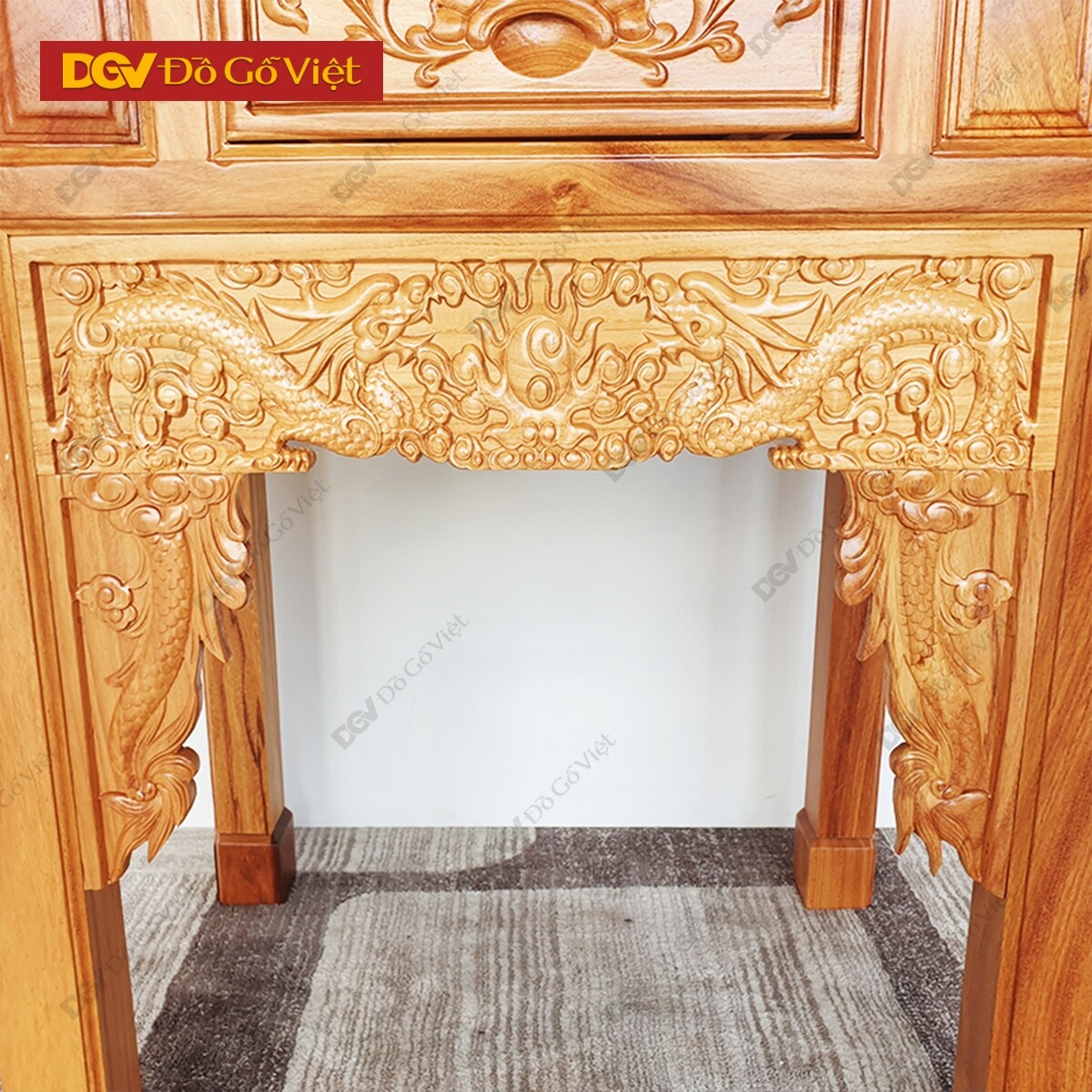 Mặt trước bàn thờ nổi bật lên với họa tiết “lưỡng long triều nhật” chạm nổi ở tư thế rồng bay cuộn mây rất ấn tượng. Được sử dụng máy CNC để đục chạm giúp cho các hoa văn trang trí tạo sự đồng đều nâng cao vẻ đẹp cho thiết kế cũng như không gian trưng bày.