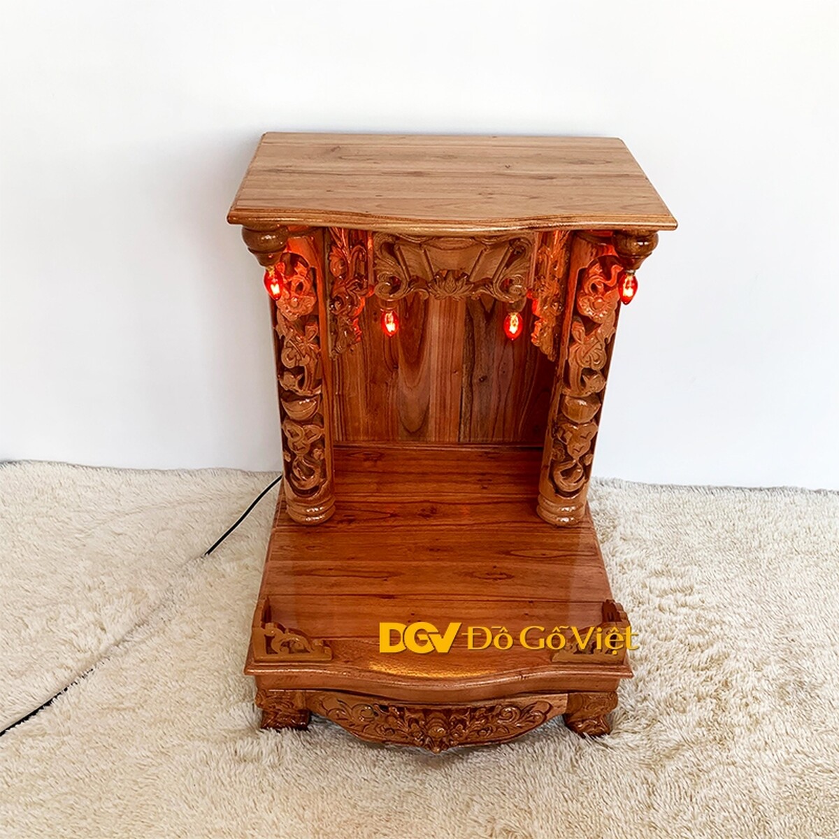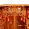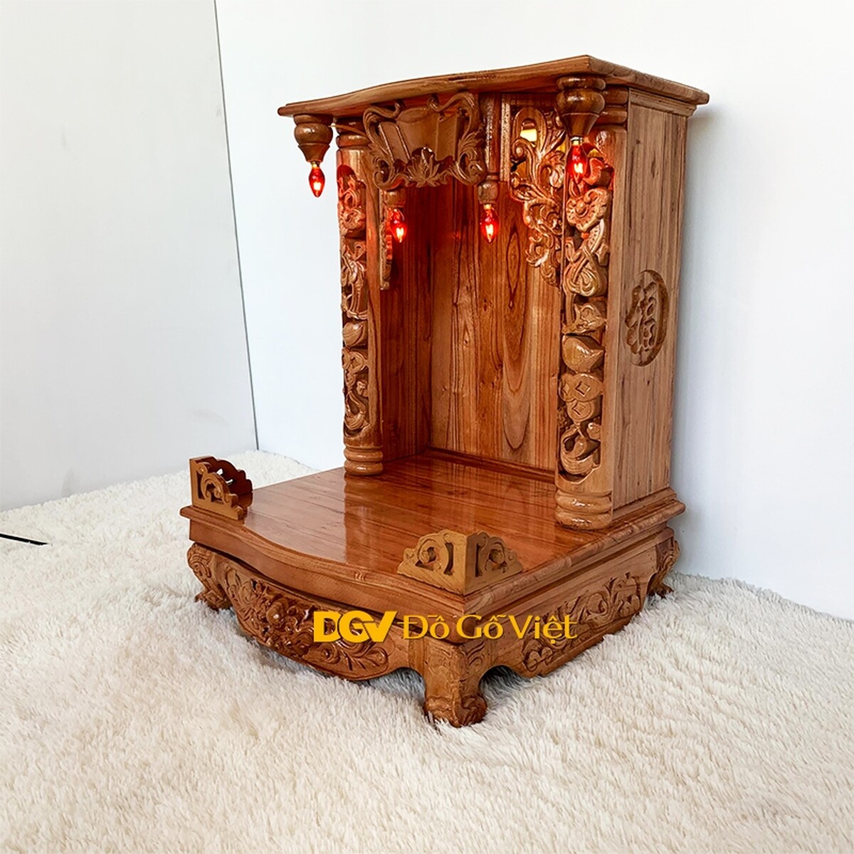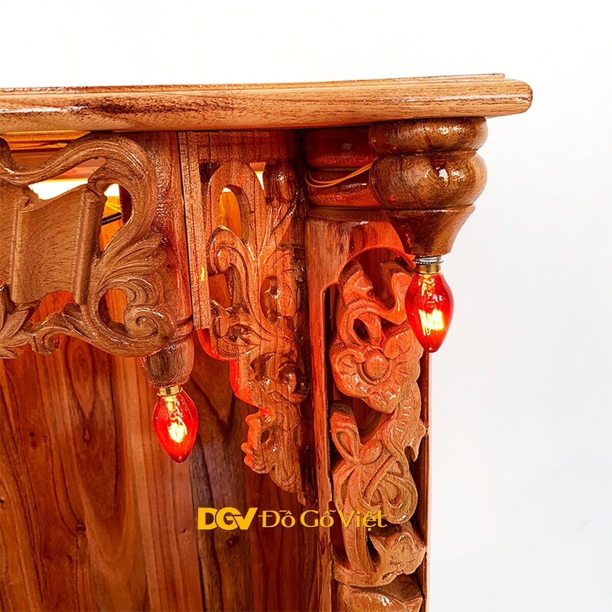 Các họa tiết được chạm nổi, chạm khuyết mang đến vẻ đẹp sắc nét và chiều sâu độc đáo. Ngoài ra, bàn thờ còn sử dụng 4 đèn quả nhót được cố định ở bên trong khu vực thờ thần và góc ngoài mái bằng như những ngôi nhà xưa mang đến nét đẹp cổ kính và khả năng thắp sáng liên tục cho sản phẩm.