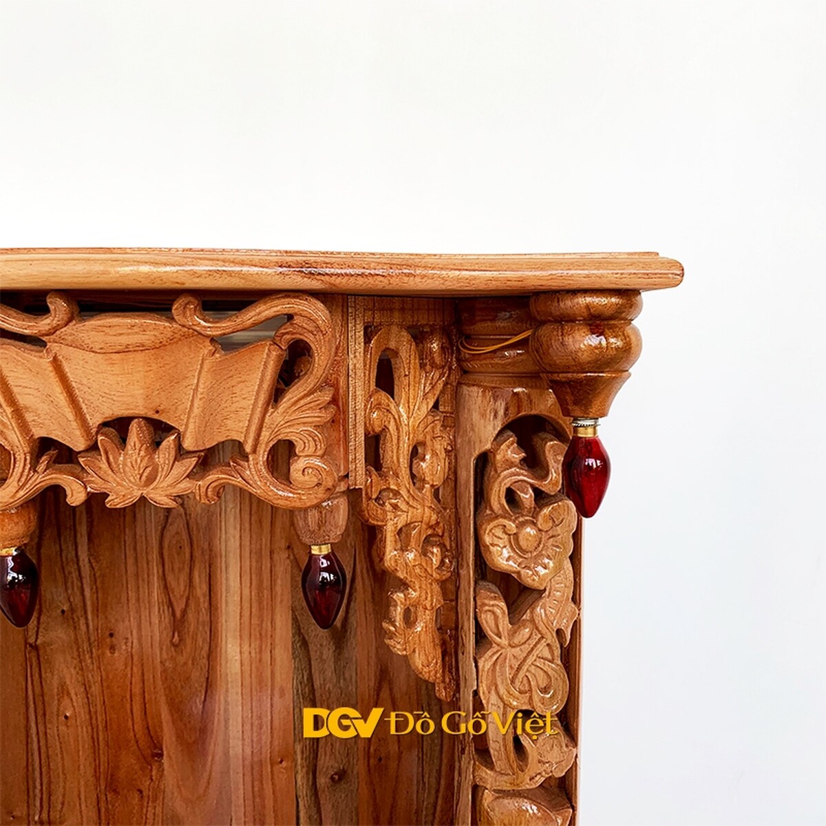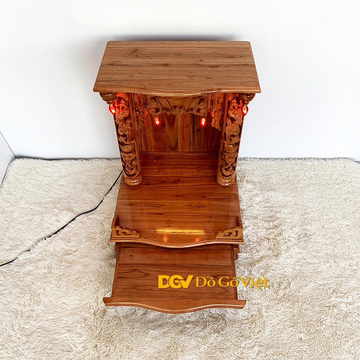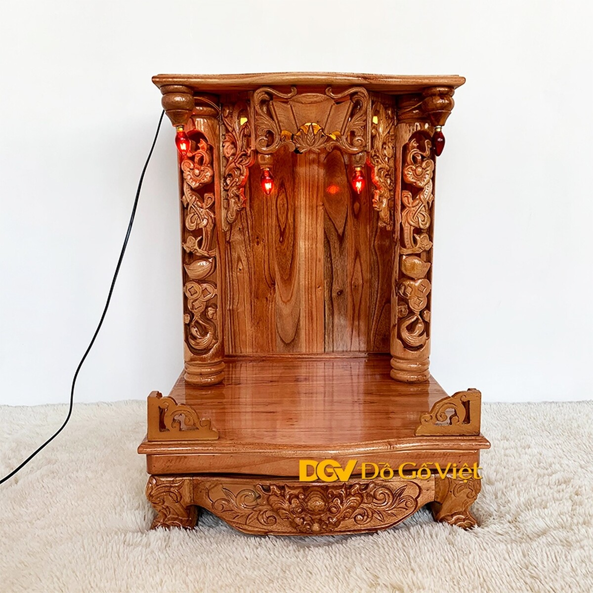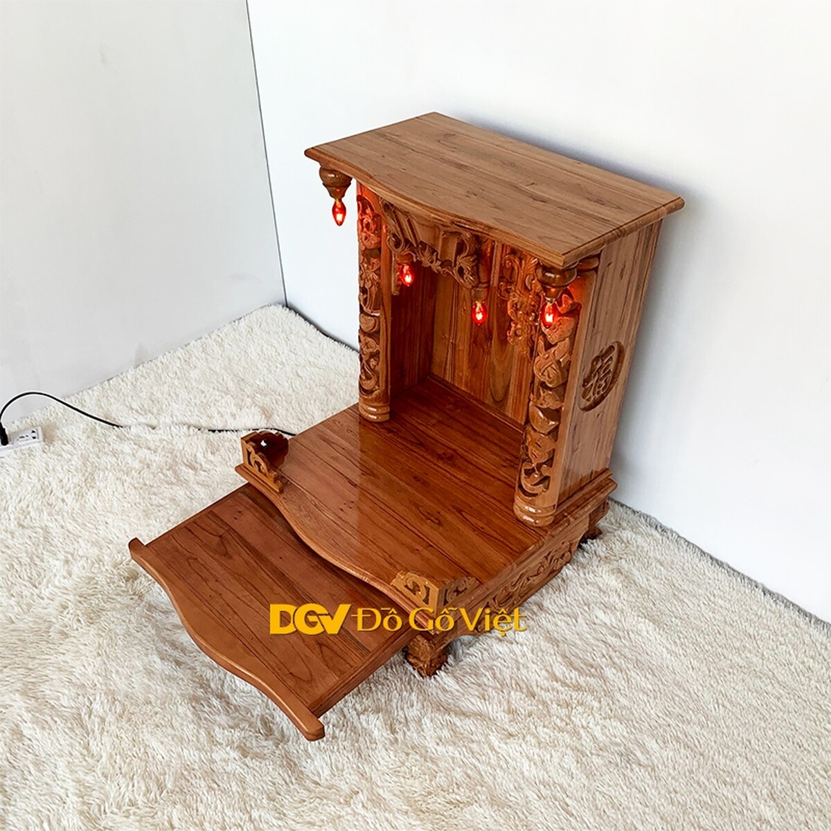 Các họa tiết được chạm nổi, chạm khuyết mang đến vẻ đẹp sắc nét và chiều sâu độc đáo. Ngoài ra, bàn thờ còn sử dụng 4 đèn quả nhót được cố định ở bên trong khu vực thờ thần và góc ngoài mái bằng như những ngôi nhà xưa mang đến nét đẹp cổ kính và khả năng thắp sáng liên tục cho sản phẩm.