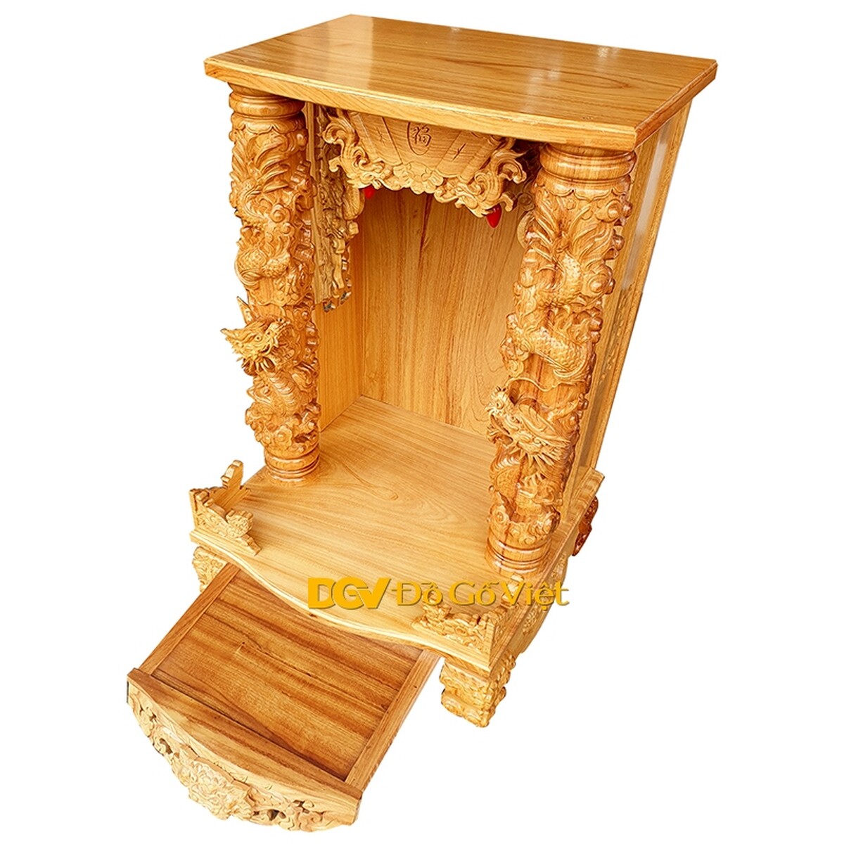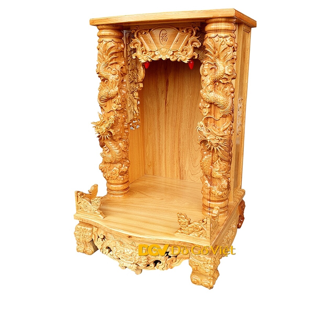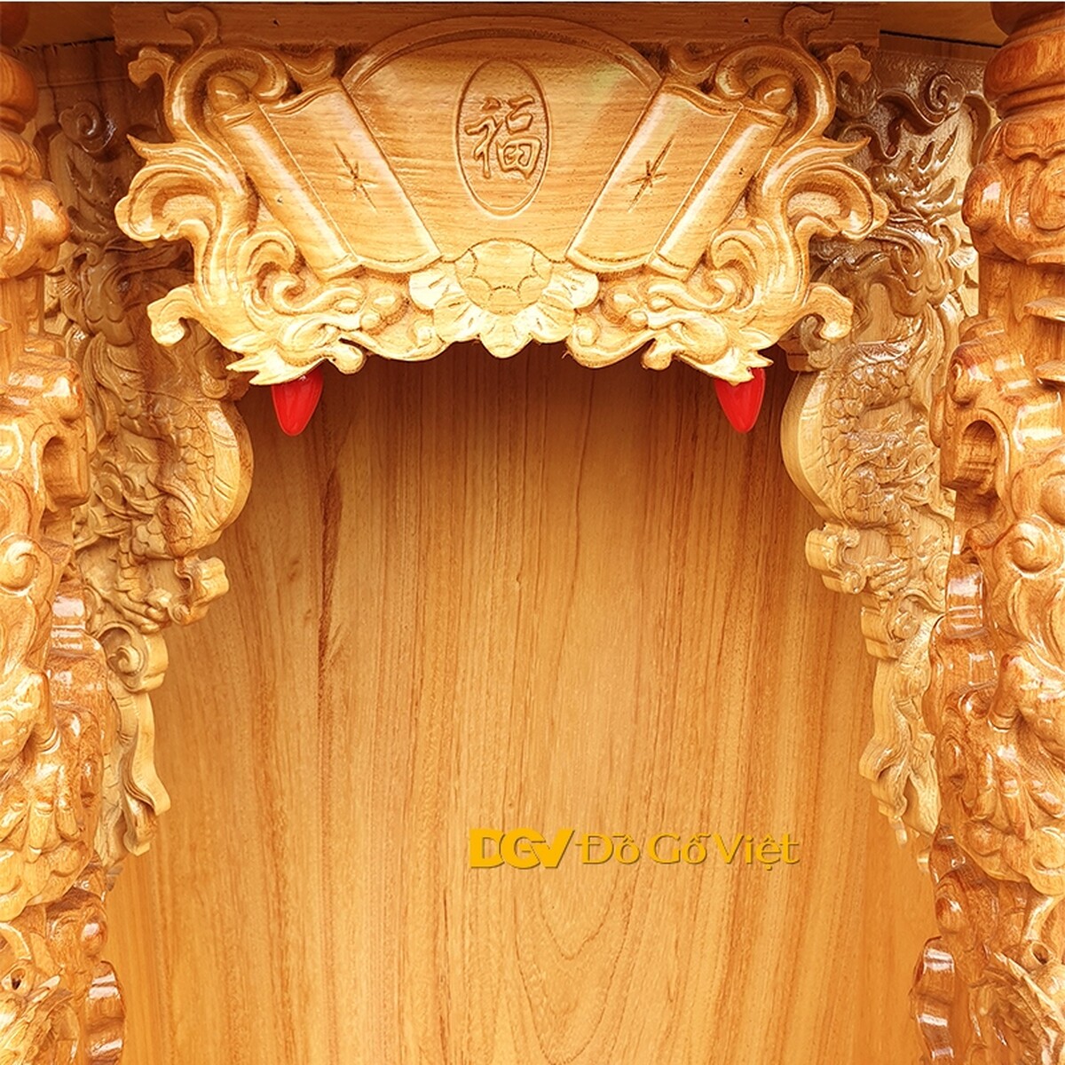 Sự tỉ mỉ, chăm chút được thể hiện rõ nét trên từng chi tiết thiết kế nhỏ từ cột trụ, mái đình đến phần bao bảo vệ và cả chân đứng bàn thờ. Với họa tiết chủ đạo là linh vật rồng, bên cạnh đó còn xuất hiện linh vật Nghê và nhiều họa tiết khác mang nhiều ý nghĩa tâm linh sâu sắc làm nổi bật giá trị phong thủy của sản phẩm.