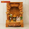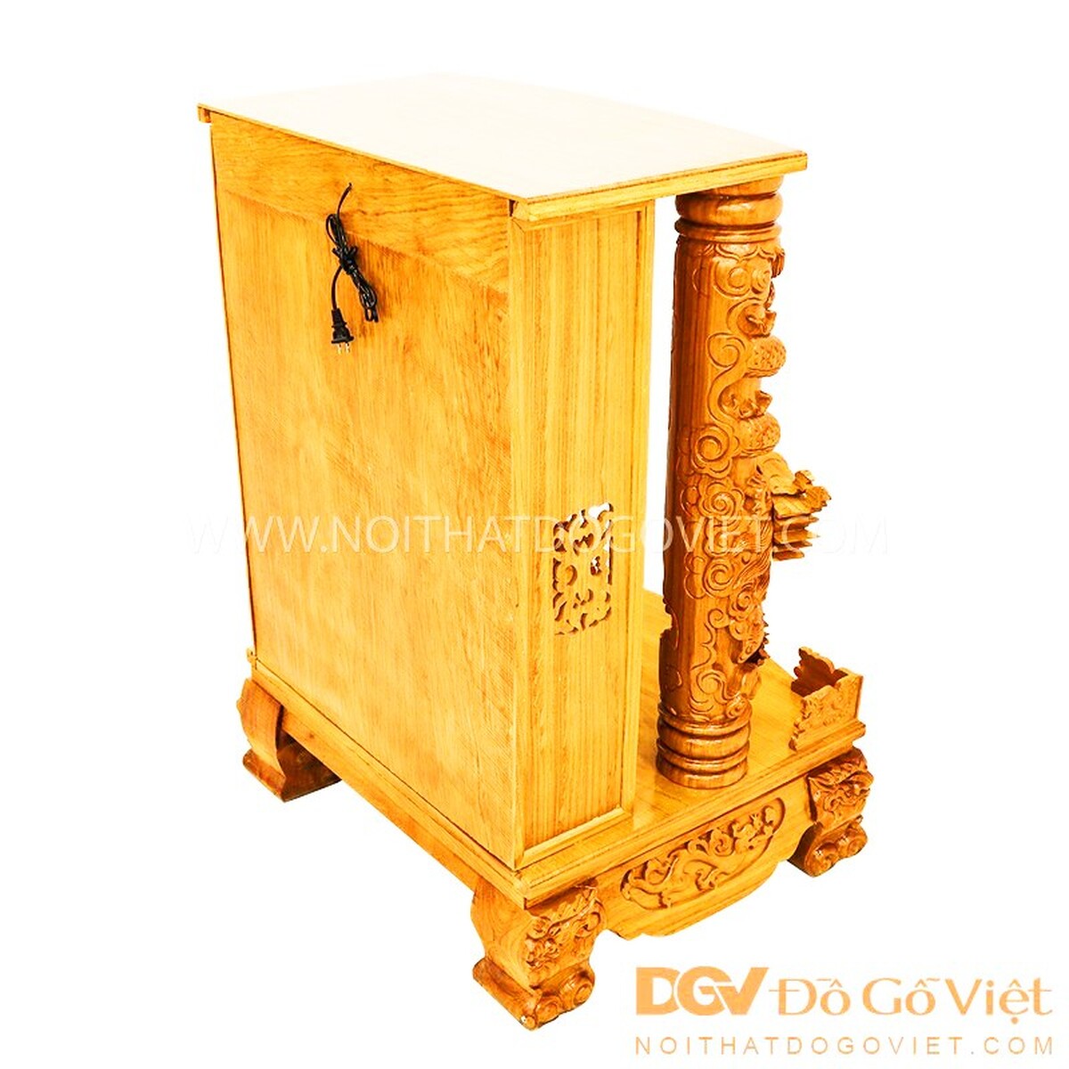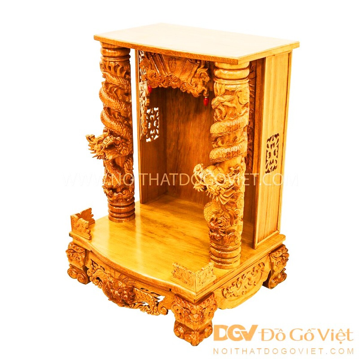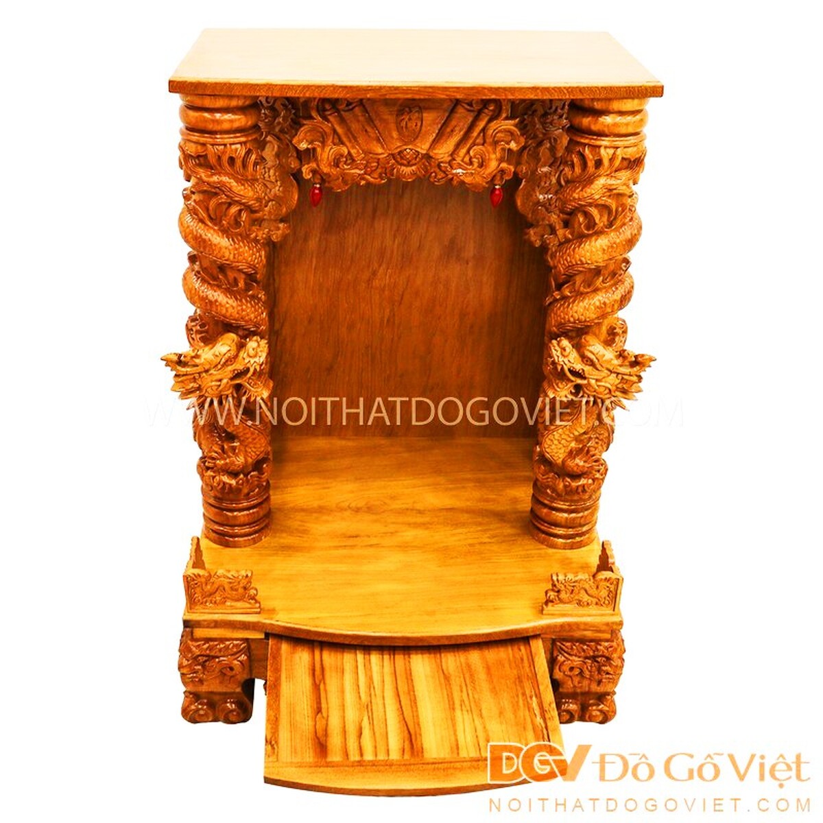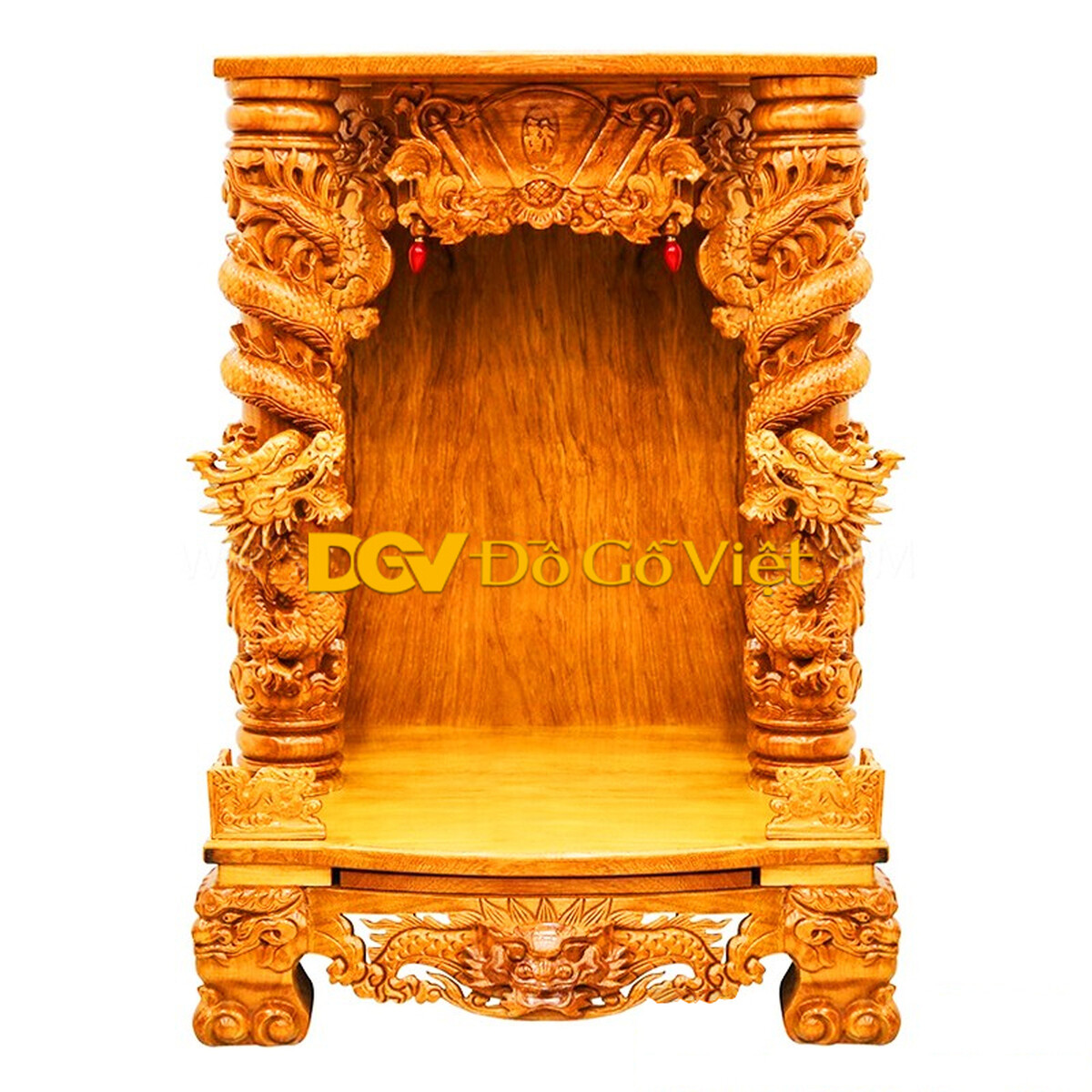 Trung tâm bàn thờ là được tạo thành kiểu mái trước tạo hình cuốn thư chạm chữ Phúc nổi bật. Hai bên là rồng vờn mây kết hợp các họa tiết hoa lá sống động, tràn đầy linh khí. Góc trên phía trước là 2 cặp rồng vừa bảo vệ đồ dùng thờ cúng khỏi rơi vỡ vừa tăng thêm vẻ đẹp hoàn thiện cho thiết kế.