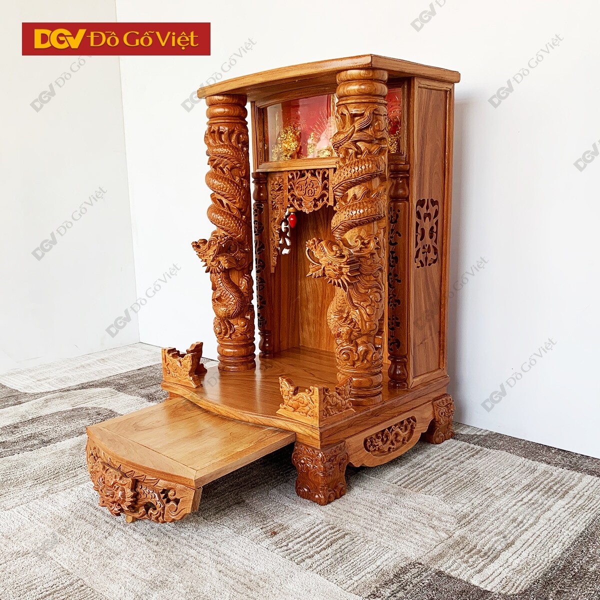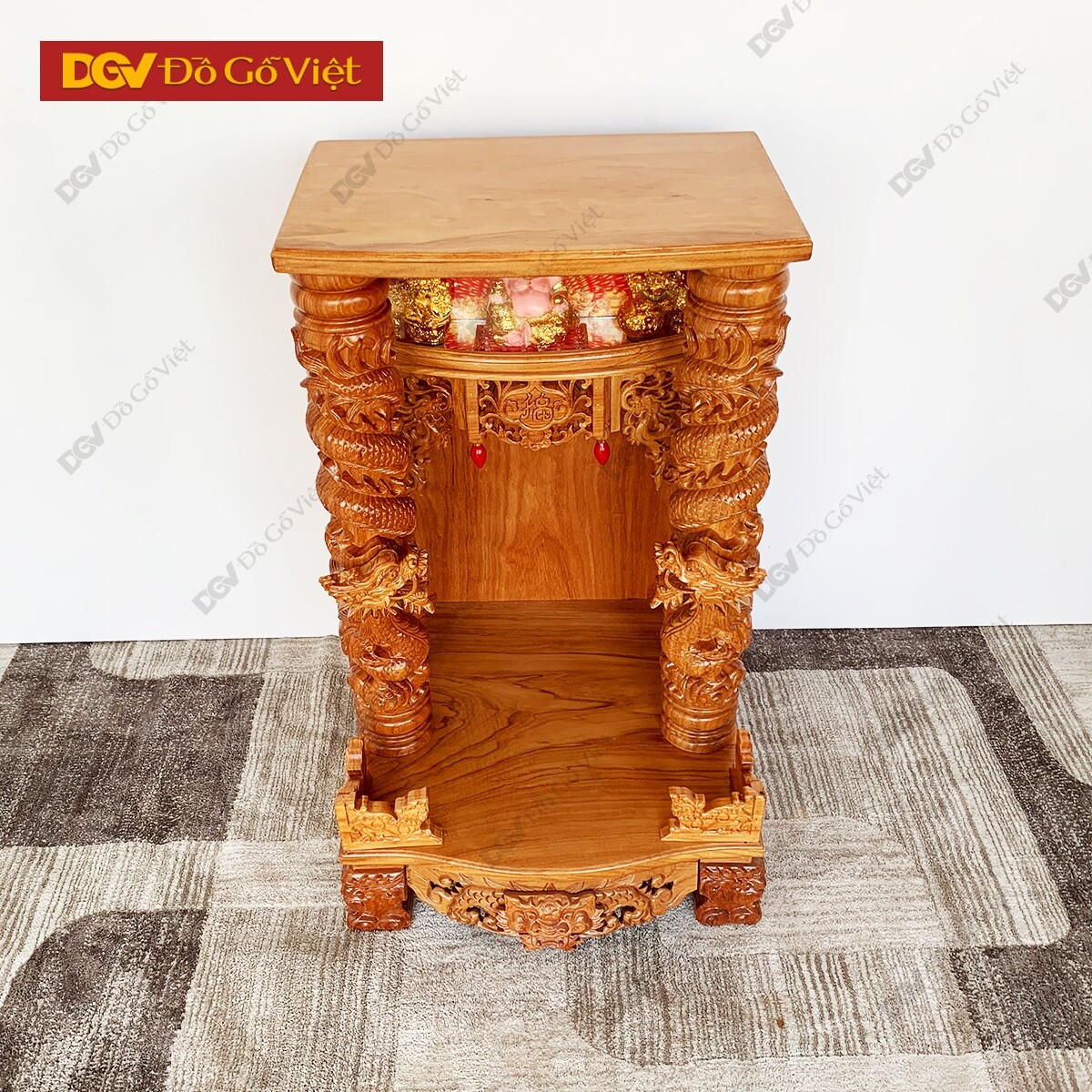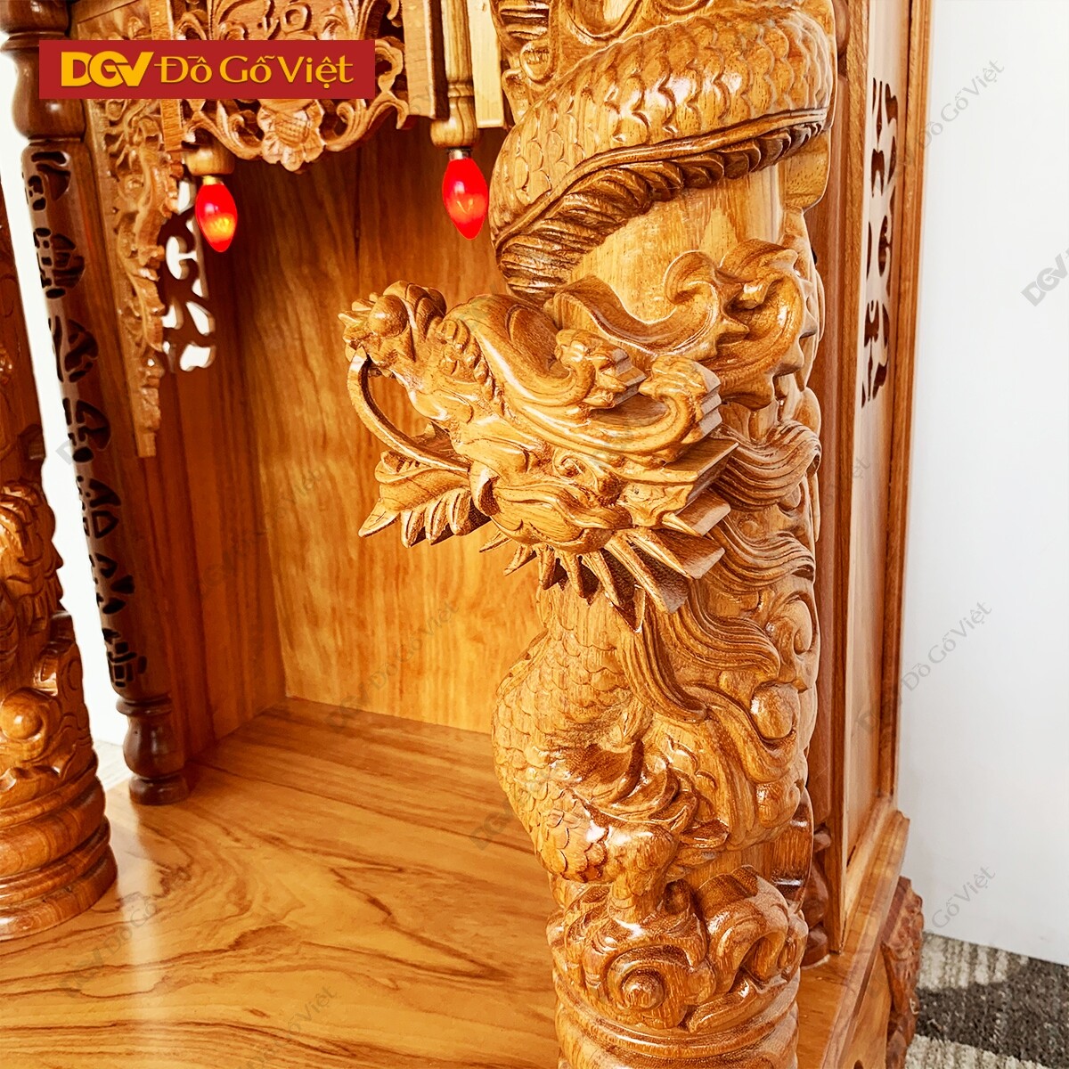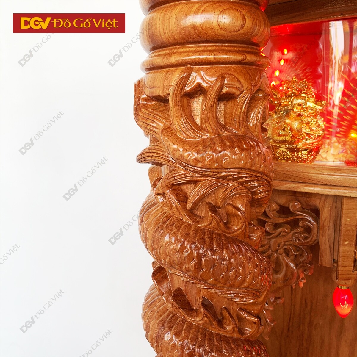 Hai cột đình cỡ lớn chạm rồng cuốn được phân chia đồng đều ở hai bên có đường kính cột 14cm vừa chịu trách nhiệm cân bằng, chống đỡ cho sản phẩm vừa là một yếu tố quan trọng trong vẻ thẩm mỹ của bàn thờ. Rồng từ xưa đã được biết là linh vật đứng đầu tứ linh với khả năng hô mưa gọi gió, đại diện cho sức mạnh của tự nhiên giúp xua đuổi tà ma, chuyển hóa các năng lượng xấu đem đến năng lượng tích cực, may mắn và sức khỏe cho gia chủ.