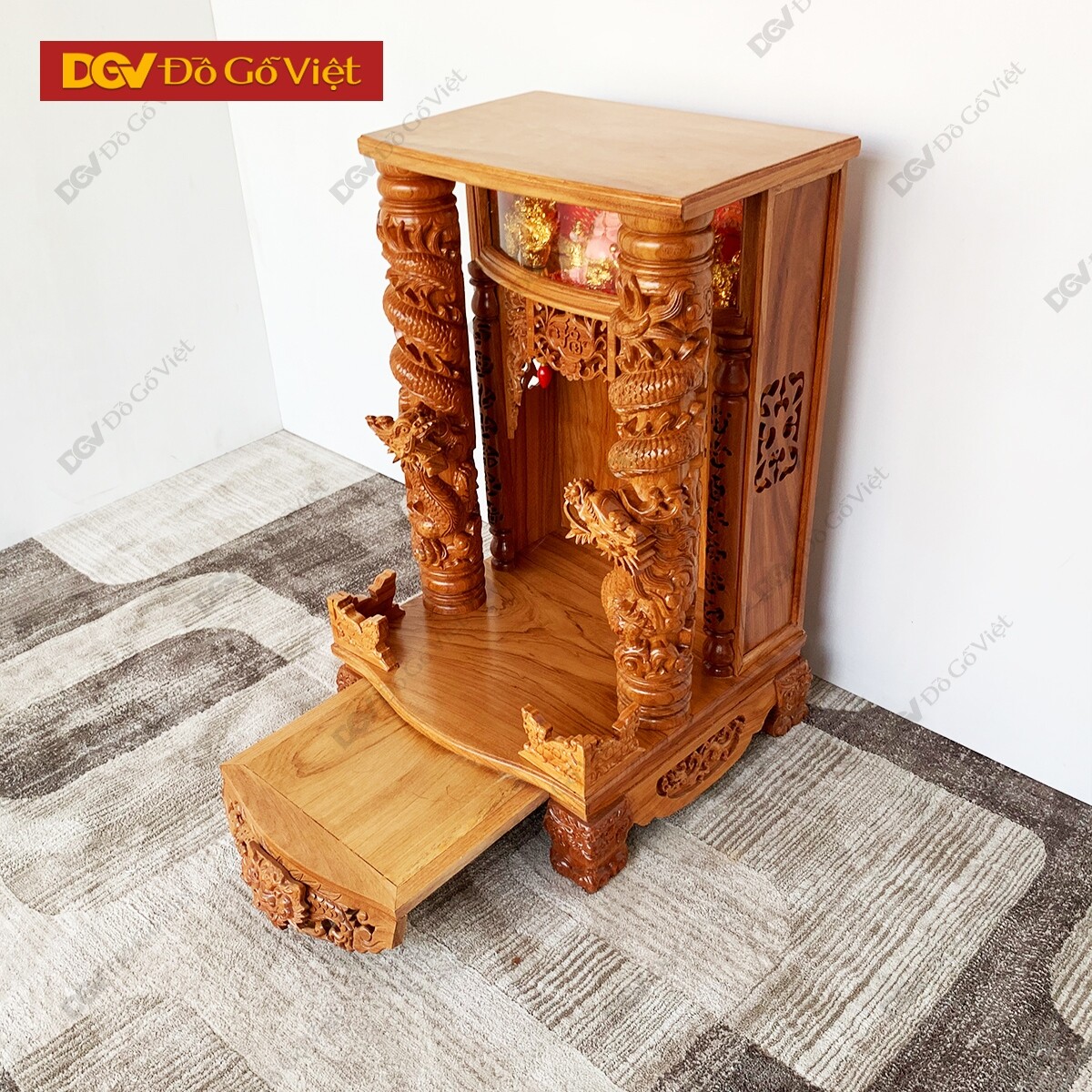 Được tạo hình theo kiểu dáng truyền thống với cột đình mái bằng. Các họa tiết trang trí, chạm nổi đầy nghệ thuật hiện diện từ chân đến đỉnh sản phẩm kể cả hai bên với những đường nét thật tỉ mỉ, tinh xảo bởi bàn tay điêu luyện và khối óc sáng tạo của những nghệ nhân thủ công khiến bàn thờ hoàn mỹ ở mọi góc cạnh.