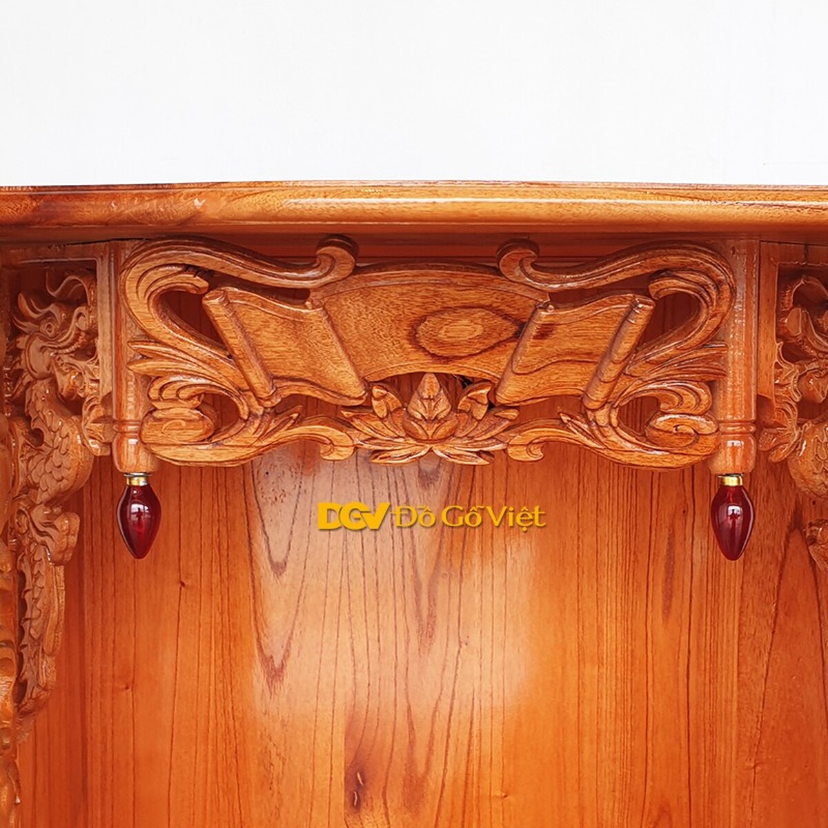 • Bàn thờ gỗ xoan đào được chạm trổ cầu kỳ với các cột trụ chạm họa tiết song long đẹp mắt. Các chi tiết đều được trau chuốt tỉ mỉ với từng đường nét hoa văn chạm nổi chân thực tạo nên nét sang trọng và đẳng cấp cho sản phẩm.