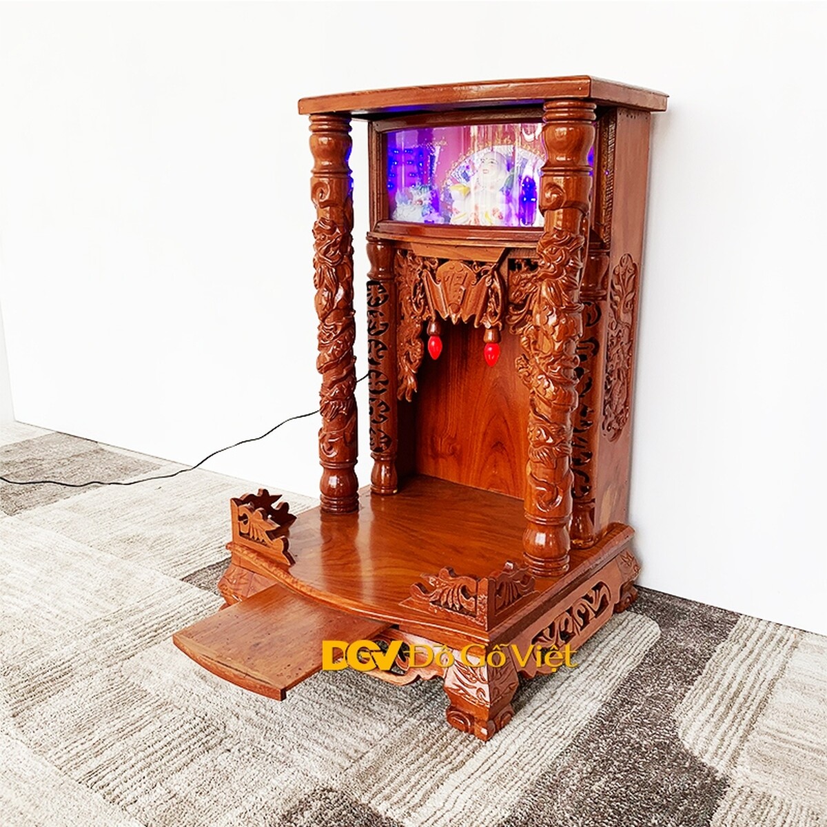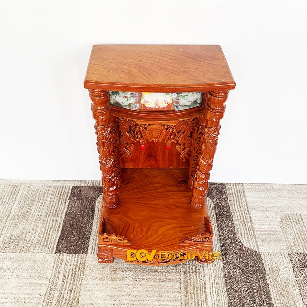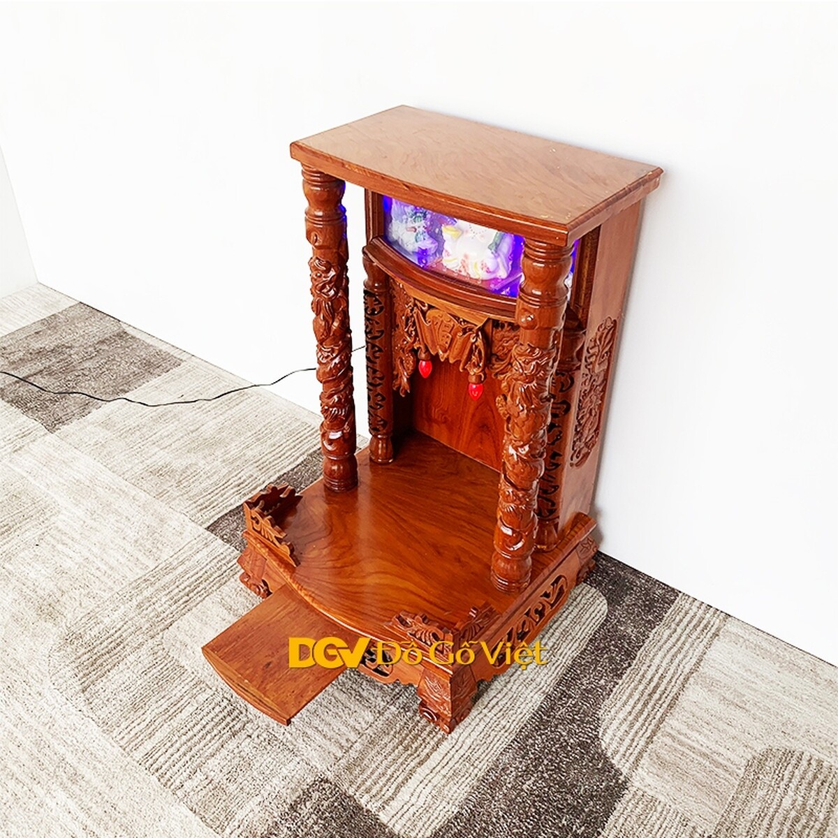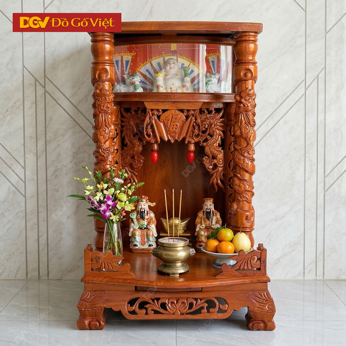 Kích thước sản phẩm là Ngang 48 x Sâu 49cm, khá nhỏ gọn nên rất phù hợp với những không gian gia đình hiện đại như căn hộ, chung cư, cửa hàng nhỏ. Dù vậy, màu sắc vàng gõ tự nhiên vẫn khiến sản phẩm trông rất bệ vệ, uy nghi giúp không gian thờ cúng dù không lớn vẫn thể hiện được sự trang trọng cần có.