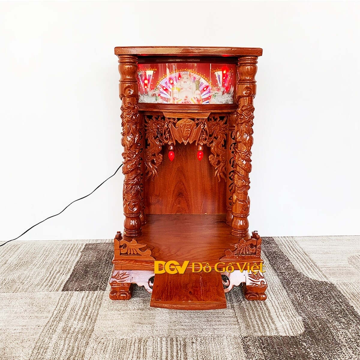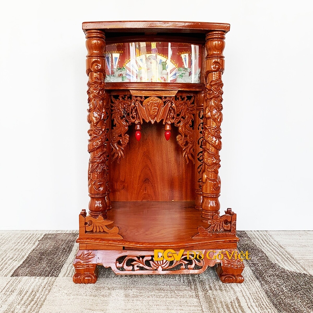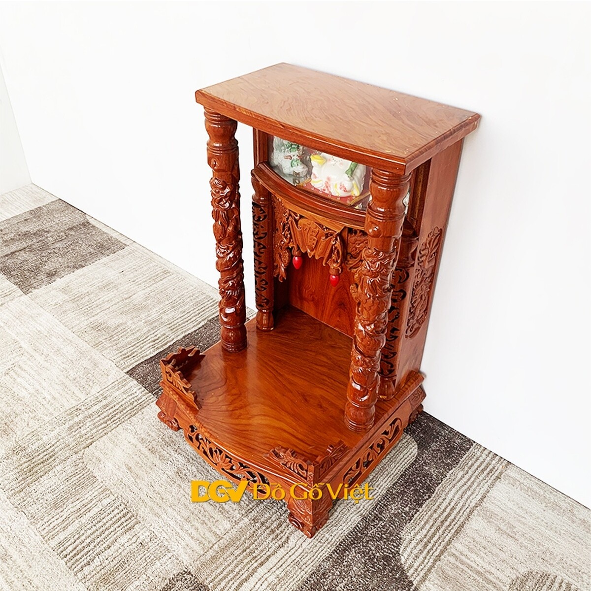 Thiết kế bàn thờ ông địa thần tài gõ được làm theo phong cách cổ điển với phần cột trụ được khắc hoa văn rồng cuốn chạm nổi trải dài khắp các mặt của cột. Với đường kính 8cm, cột trụ vô cùng vững chắc để chống đỡ cho phần mái bằng bên trên tạo nên một kết cấu vững chắc.