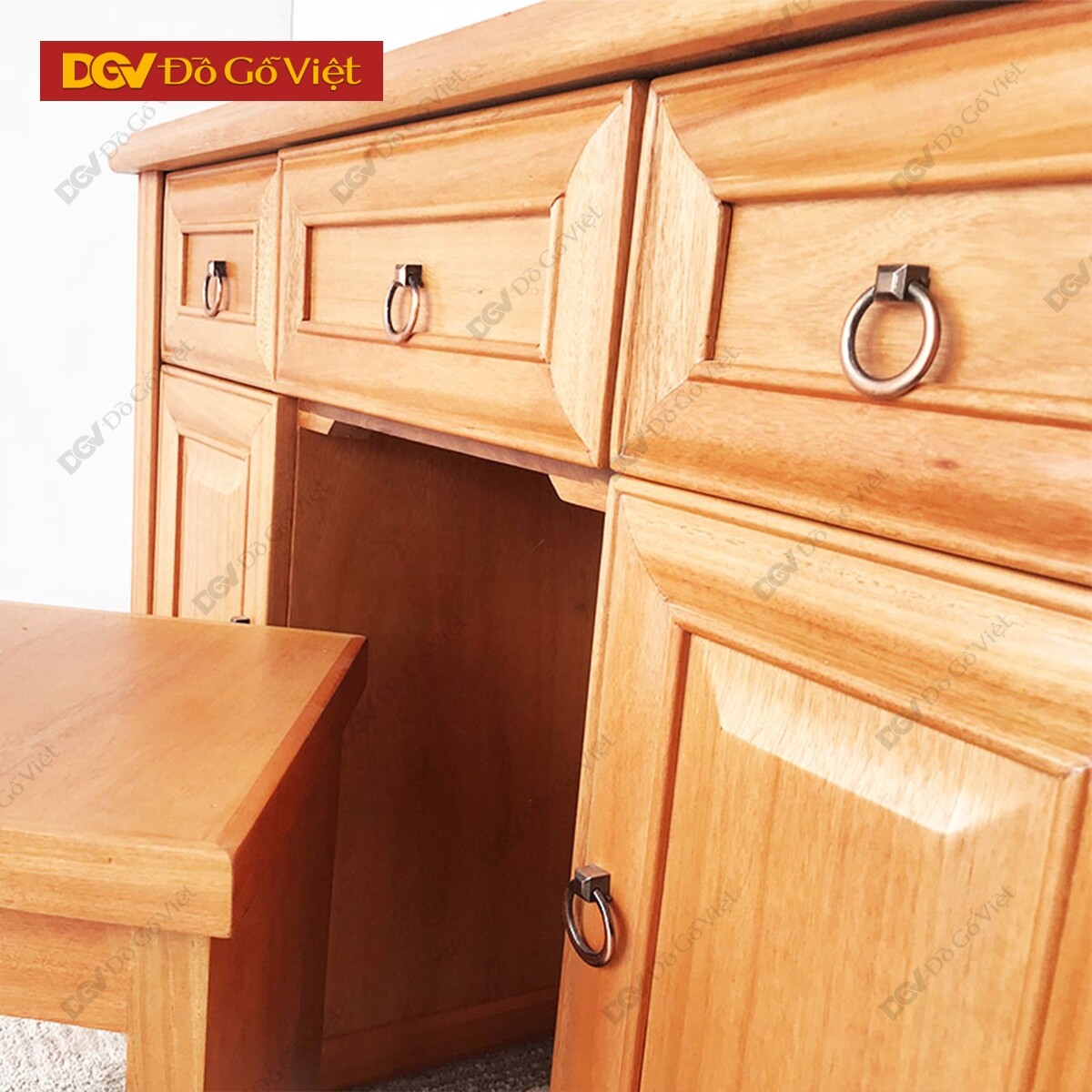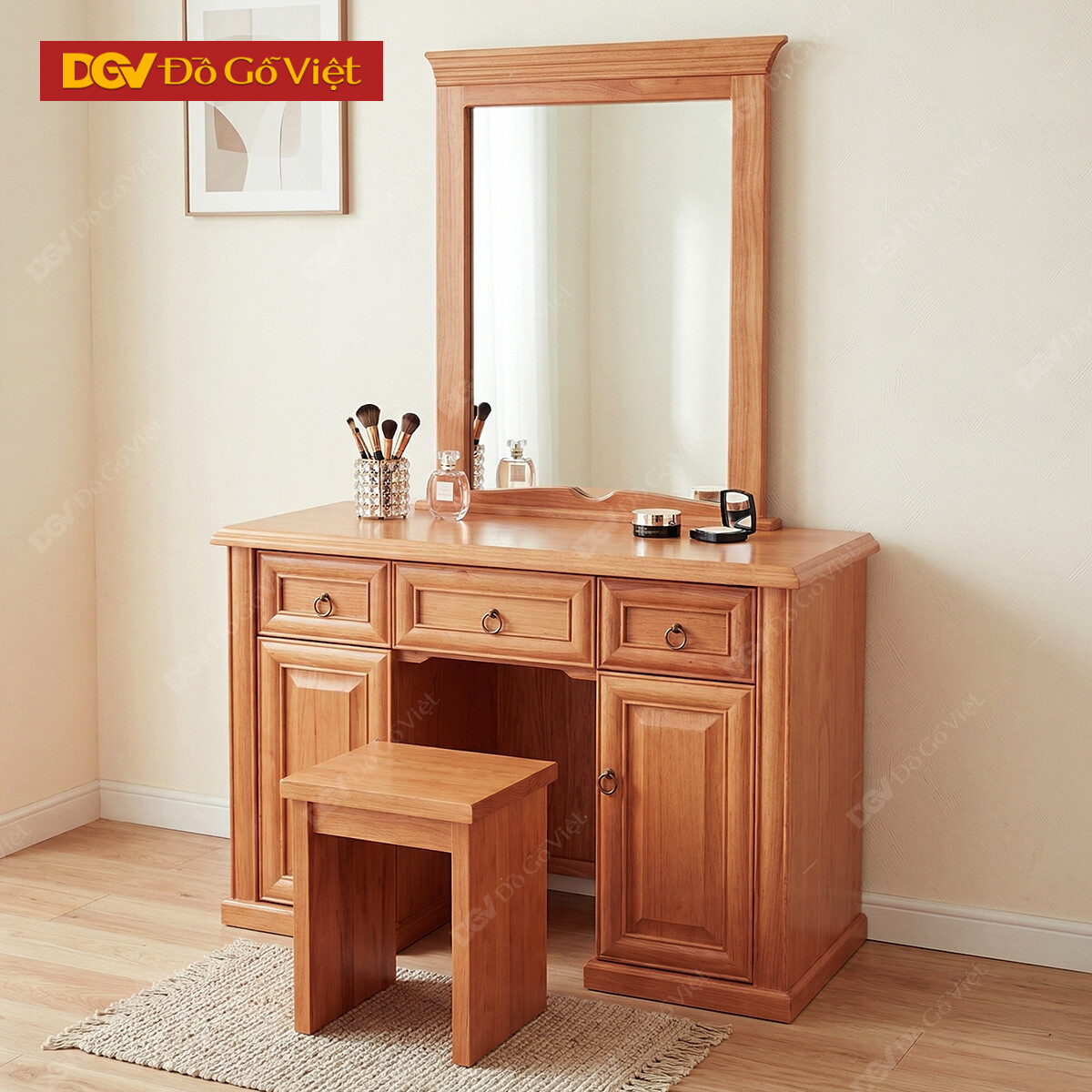 Ngoài chất lượng vượt trội, bàn phấn làm từ gỗ đinh hương cũng mang đến gam màu vàng nâu nhẹ nhàng, trầm ấm đầy nghệ thuật kiến tạo một góc lãng mạn dành riêng cho sở thích trang điểm của chị em.