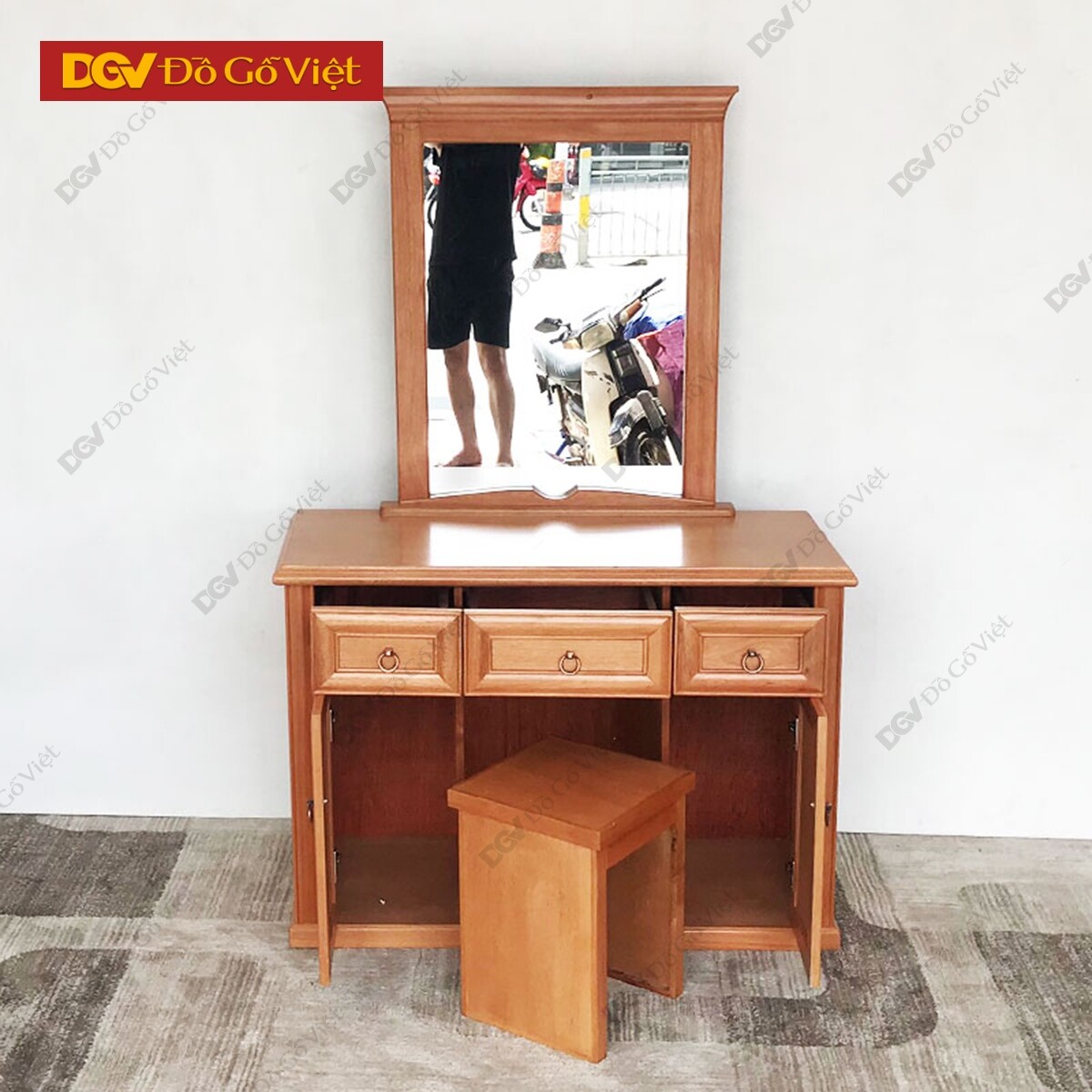 Mẫu bàn phấn gỗ tự nhiên này sở hữu kích thước cỡ vừa có thể bày trí trong không gian cỡ vừa và lớn mà không sợ quá tốn kém diện tích hay khiến không gian trở nên trống trải. Mặt gương chữ nhật lớn vớt viền vát dứt khoát tạo ra góc nhìn rộng thoáng cho bạn thuận tiện rất nhiều trong quá trình trang điểm.