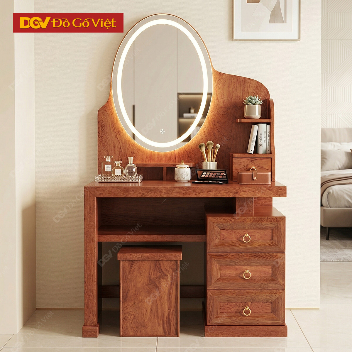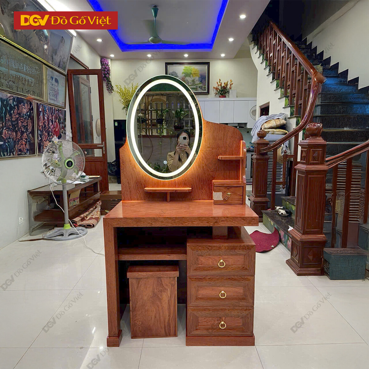 Bàn Trang Điểm Gỗ Hương Đá Gương Led Oval Kèm Hộc Kéo