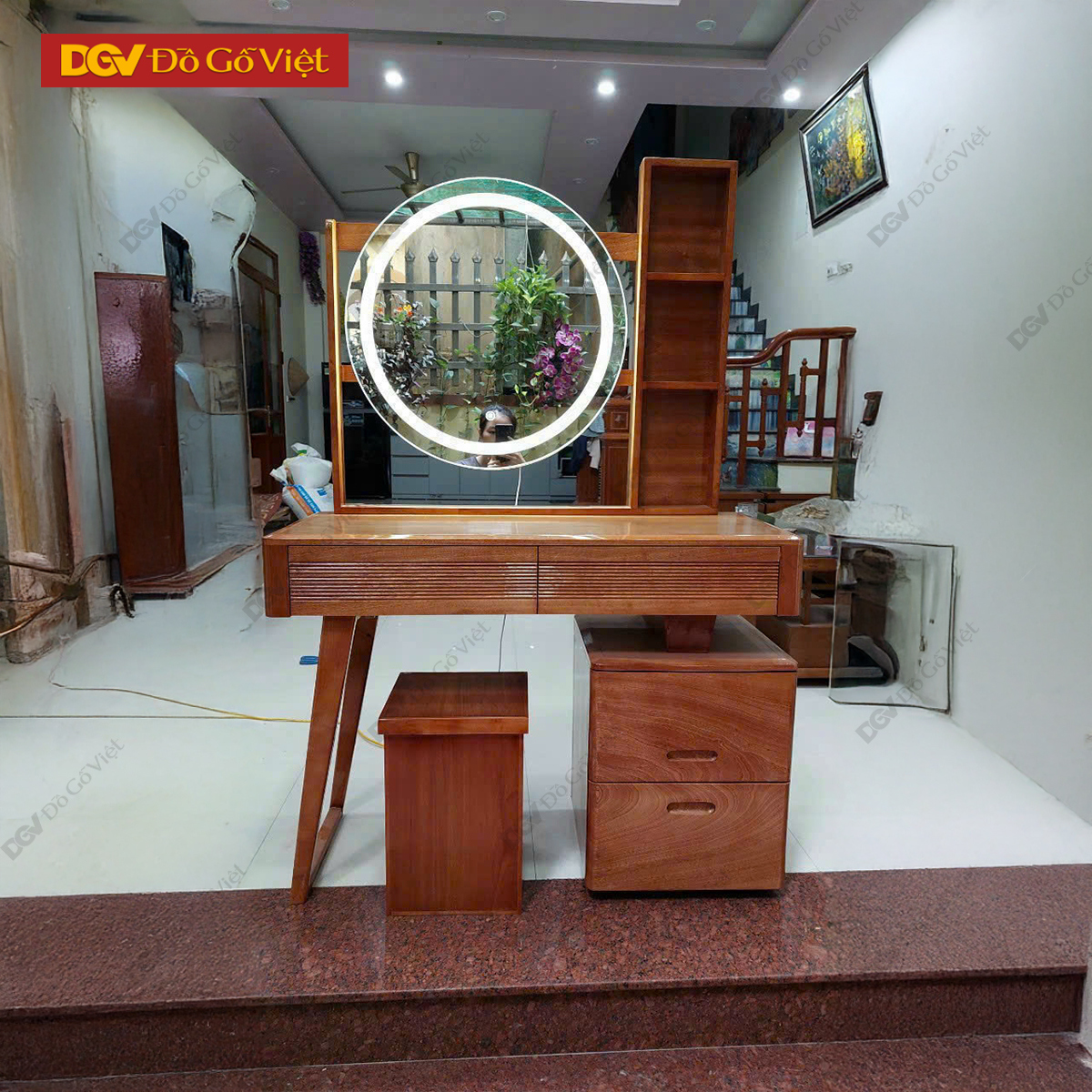 Bàn Trang Điểm Gỗ Hương Đá Gương Led Tròn Có Ghế Đi Kèm