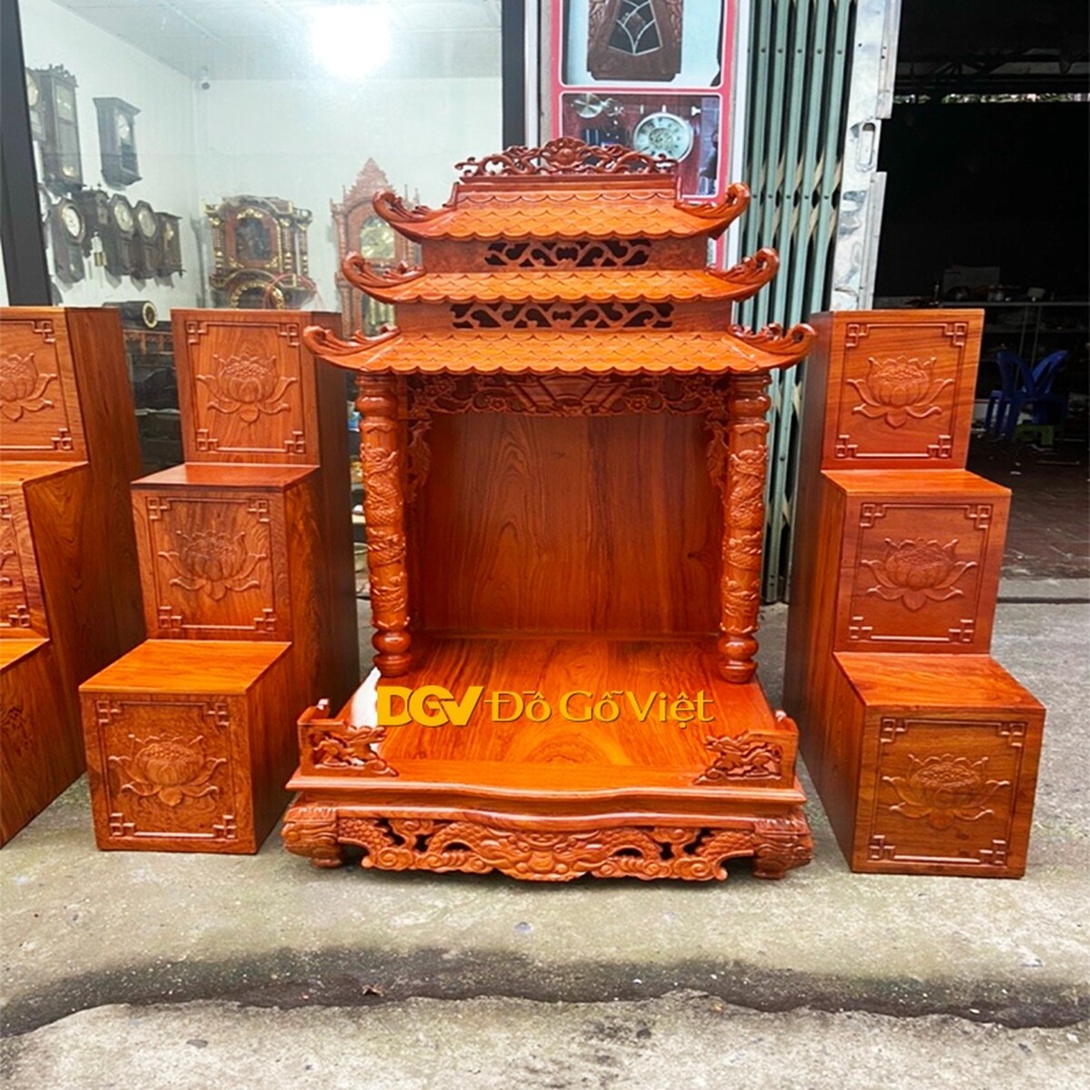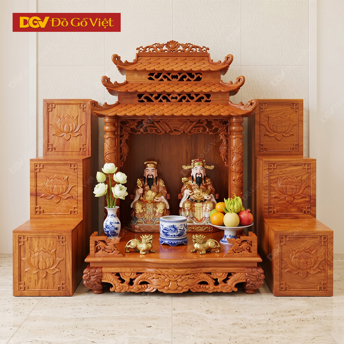 Bộ 3 Bàn Thờ Thần Tài Gỗ Hương Và Tam Cấp Màu Tự Nhiên