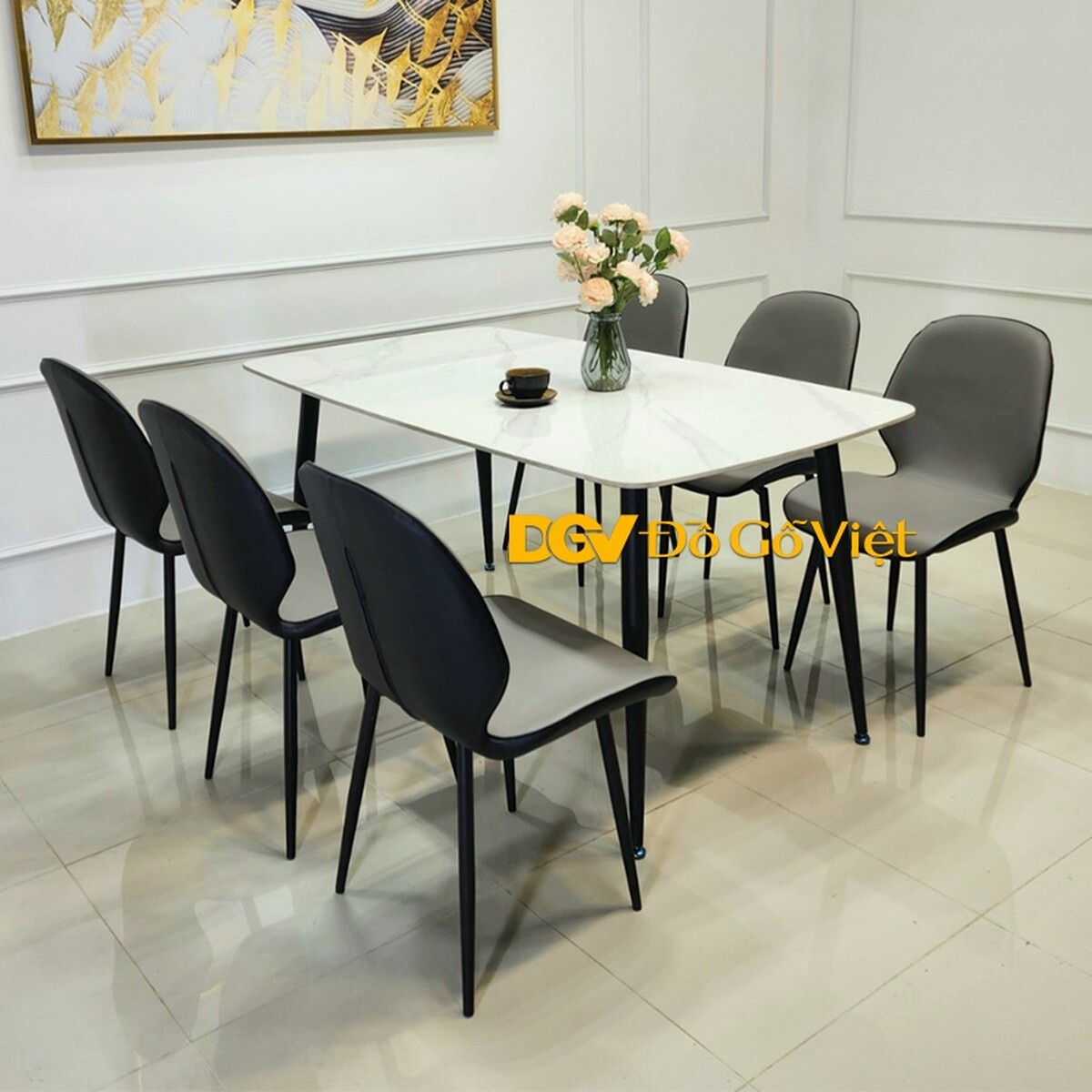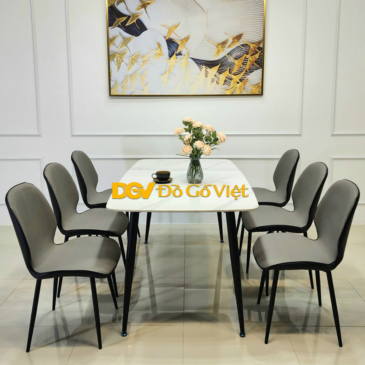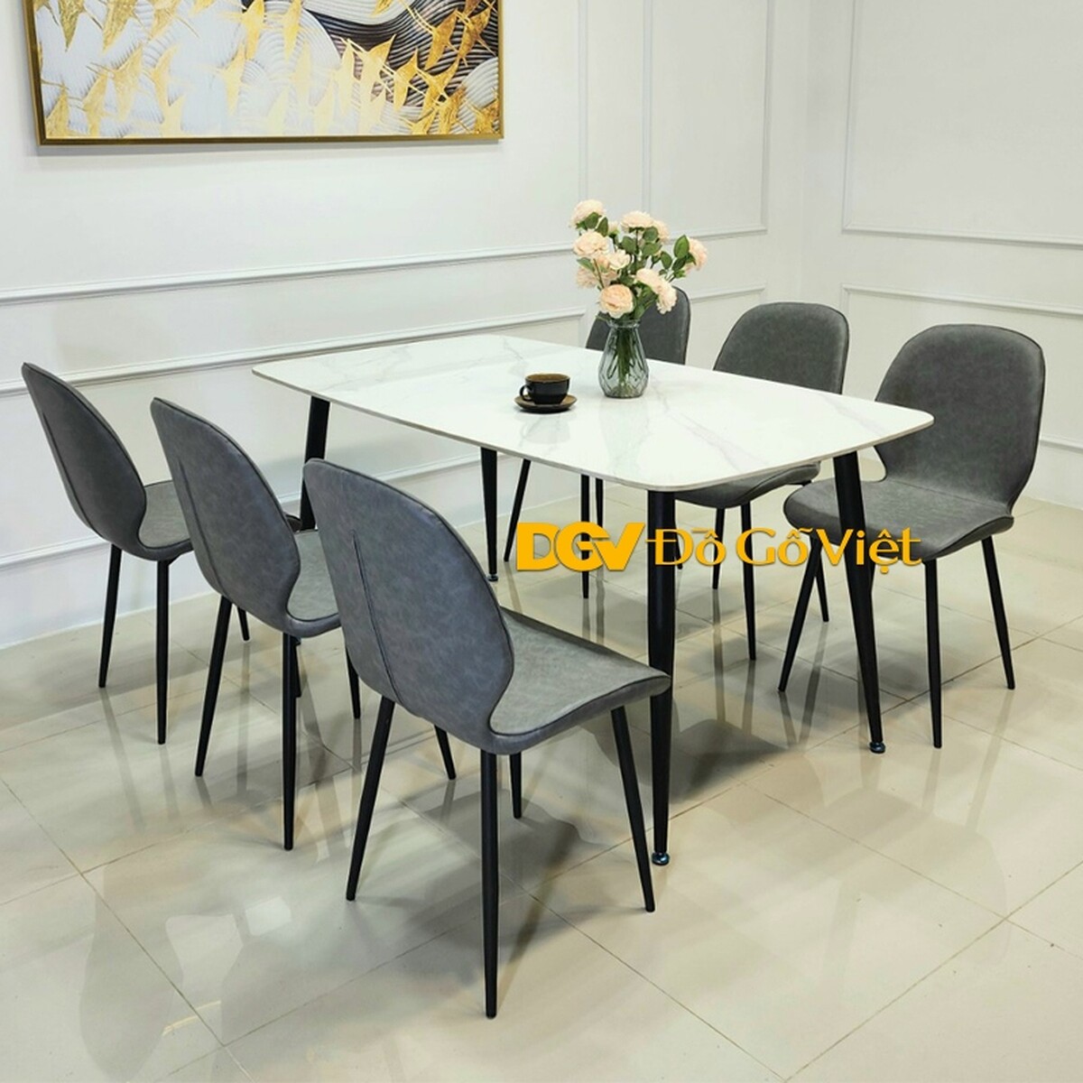 Bộ Bàn Ăn Chân Sắt Mặt Đá Bền Bỉ 6 Ghế Cho Chung Cư