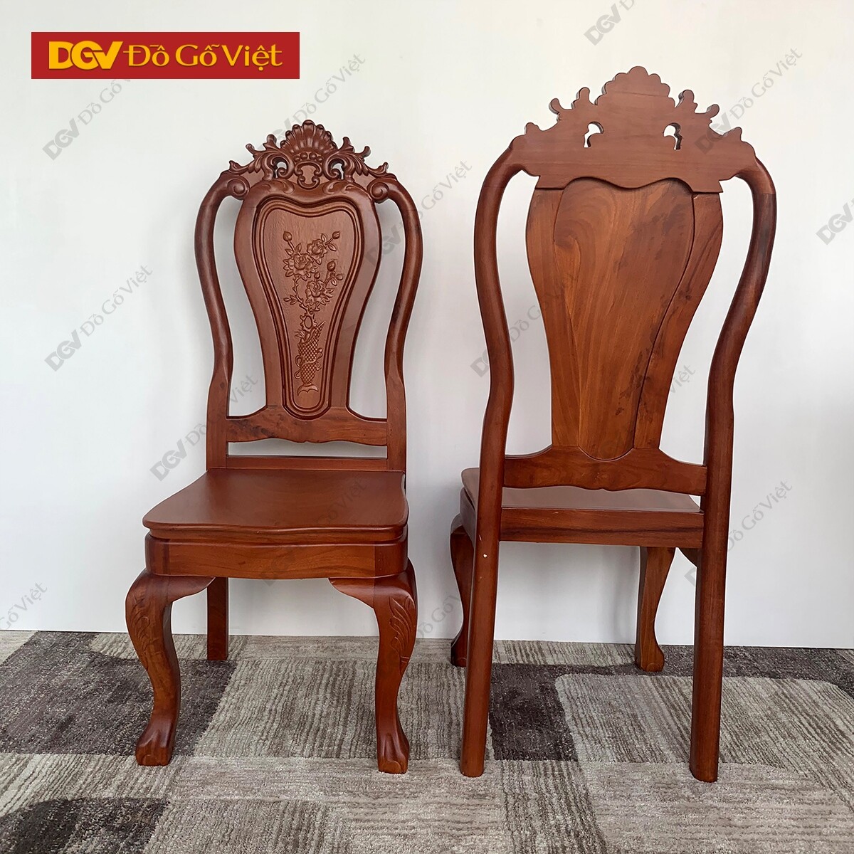 • Ghế ngồi làm theo kiểu cổ điển đặc trưng với 2 chân trước được làm cong nhẹ, 2 chân sau làm thẳng giúp cân bằng giữa tính thẩm mỹ & tính ổn định trong ứng dụng thực tế. Lưng ghế tựa làm dạng bảng lớn chạm họa tiết hoa nở khá đẹp, được chạm nổi nhẹ vừa với chiều dày mặt lưng, không gây khó chịu cho người dùng khi tựa lưng.
