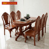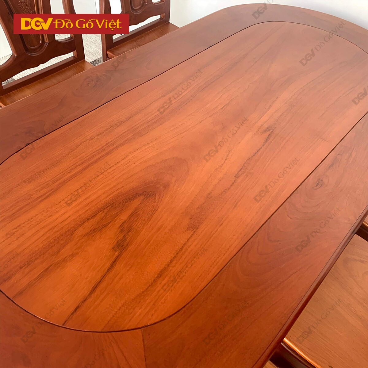 • ​Bàn ghế ăn được thiết kế theo kiểu oval giúp tiết kiệm diện tích không gian tốt hơn so với kiểu bàn hình chữ nhật. Mặt bàn được chọn lựa từ tấm gỗ gõ đỏ lớn có vân gỗ & màu sắc  ấn tượng nhất. Mặt bên được chạm hoa văn cách điệu đối xứng, kết hợp đường viền đẹp cân bằng giữa phần mặt và chân bàn.