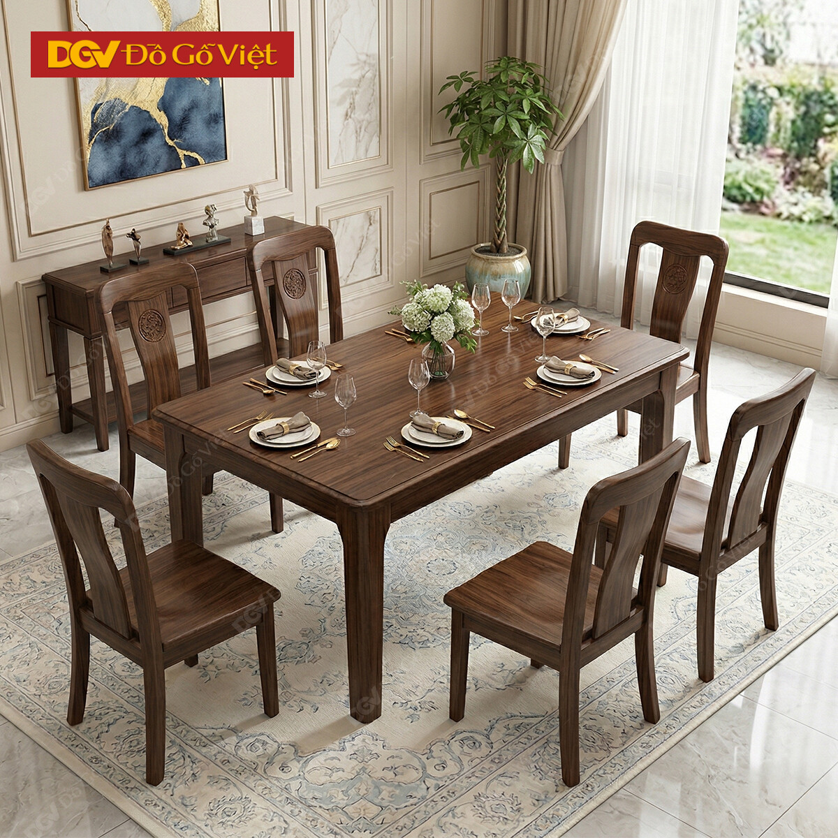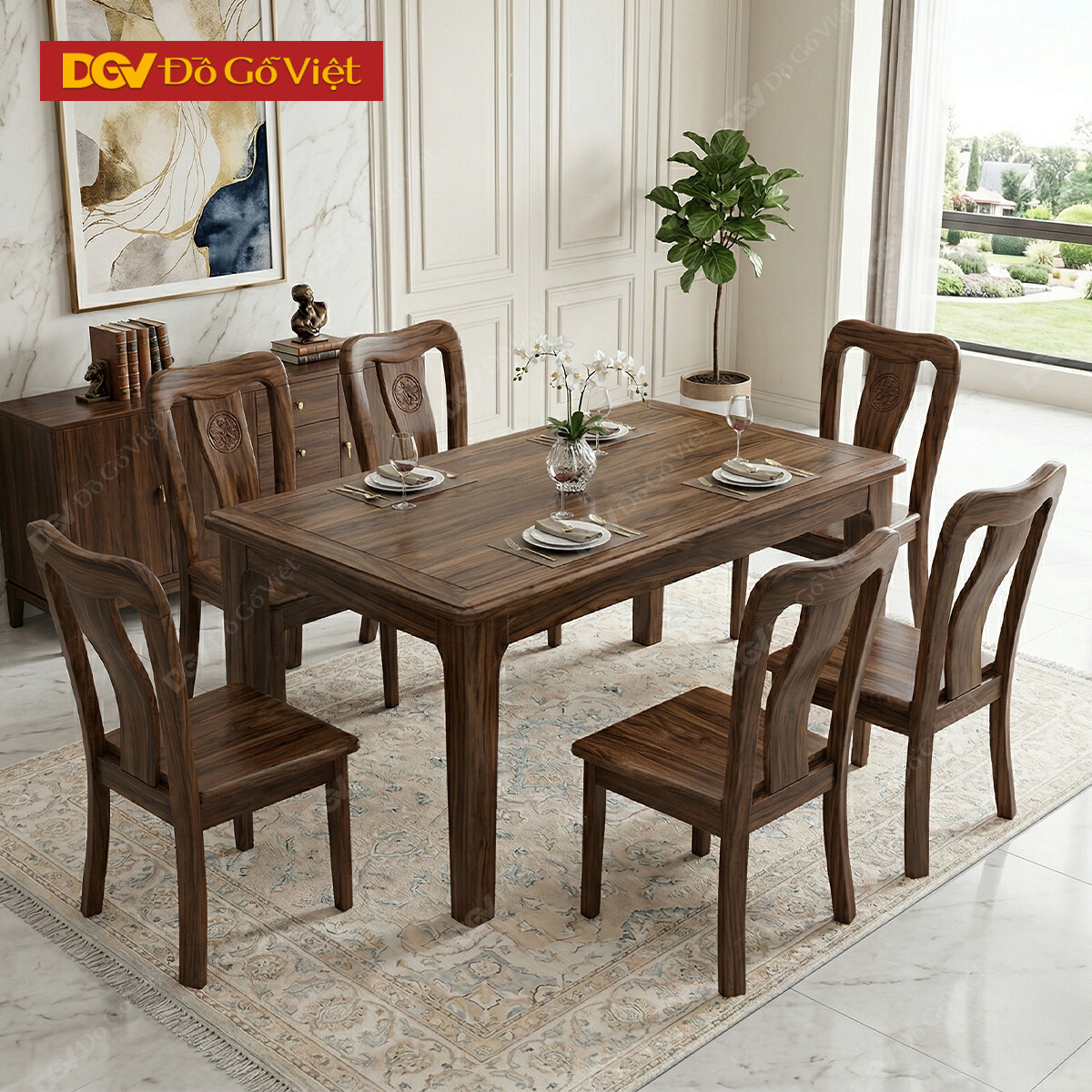 Bộ Bàn Ăn Gỗ Óc Chó Cao Cấp Á Đông Cổ Điển Ghế Chạm Khắc