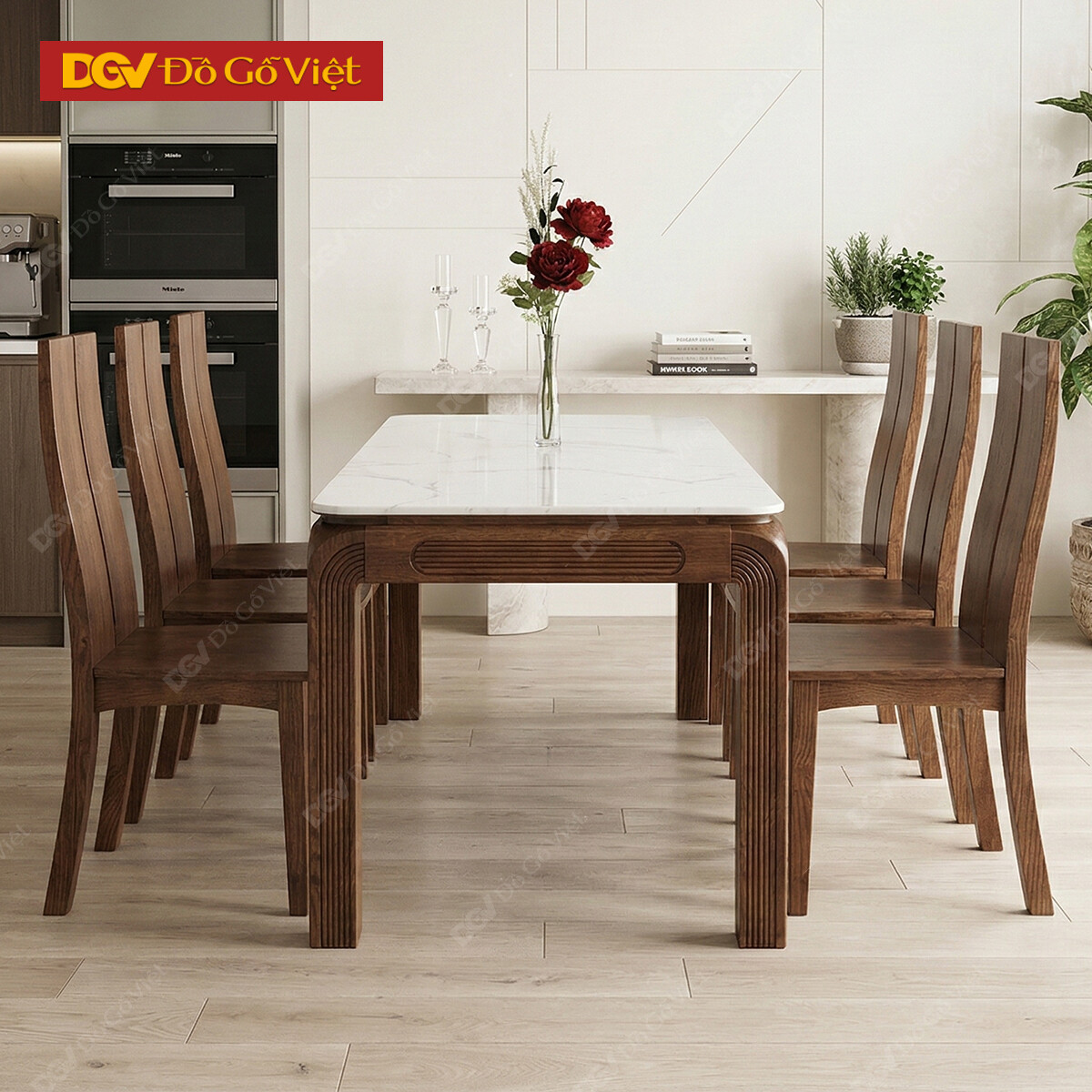 Bộ Bàn Ăn Mặt Đá Chữ Nhật Gỗ Sồi Lau Màu Óc Chó