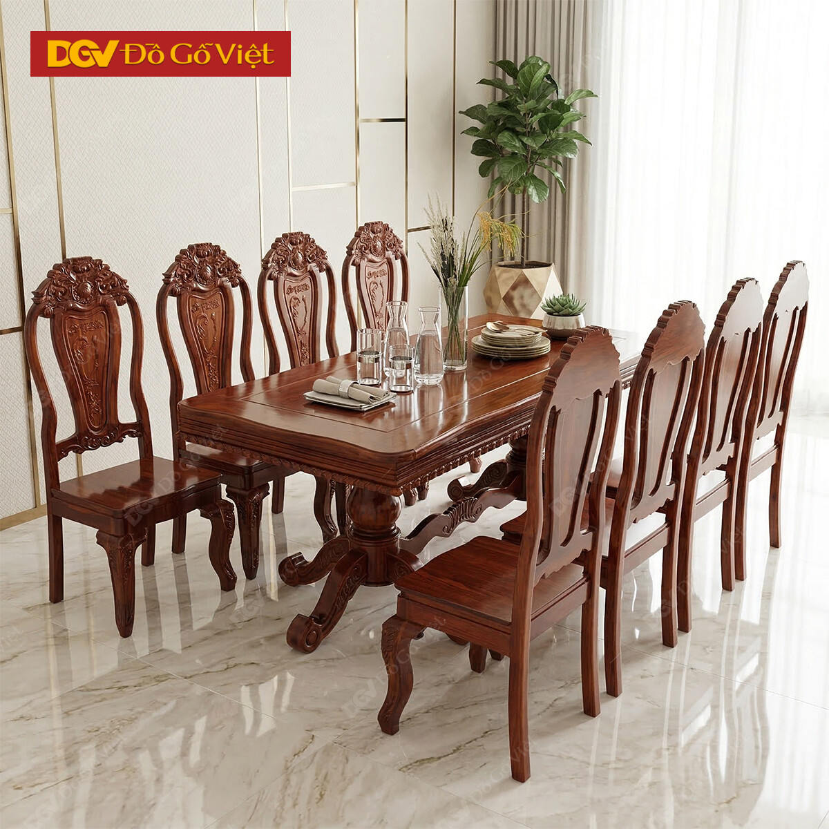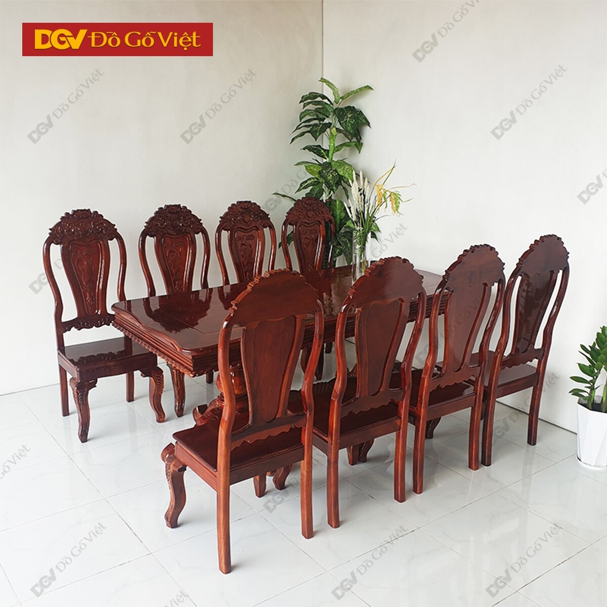 Bộ Bàn Ăn Tràm Mặt Hồng Đào Bánh Tây Cổ Điển 1m9 8 Ghế