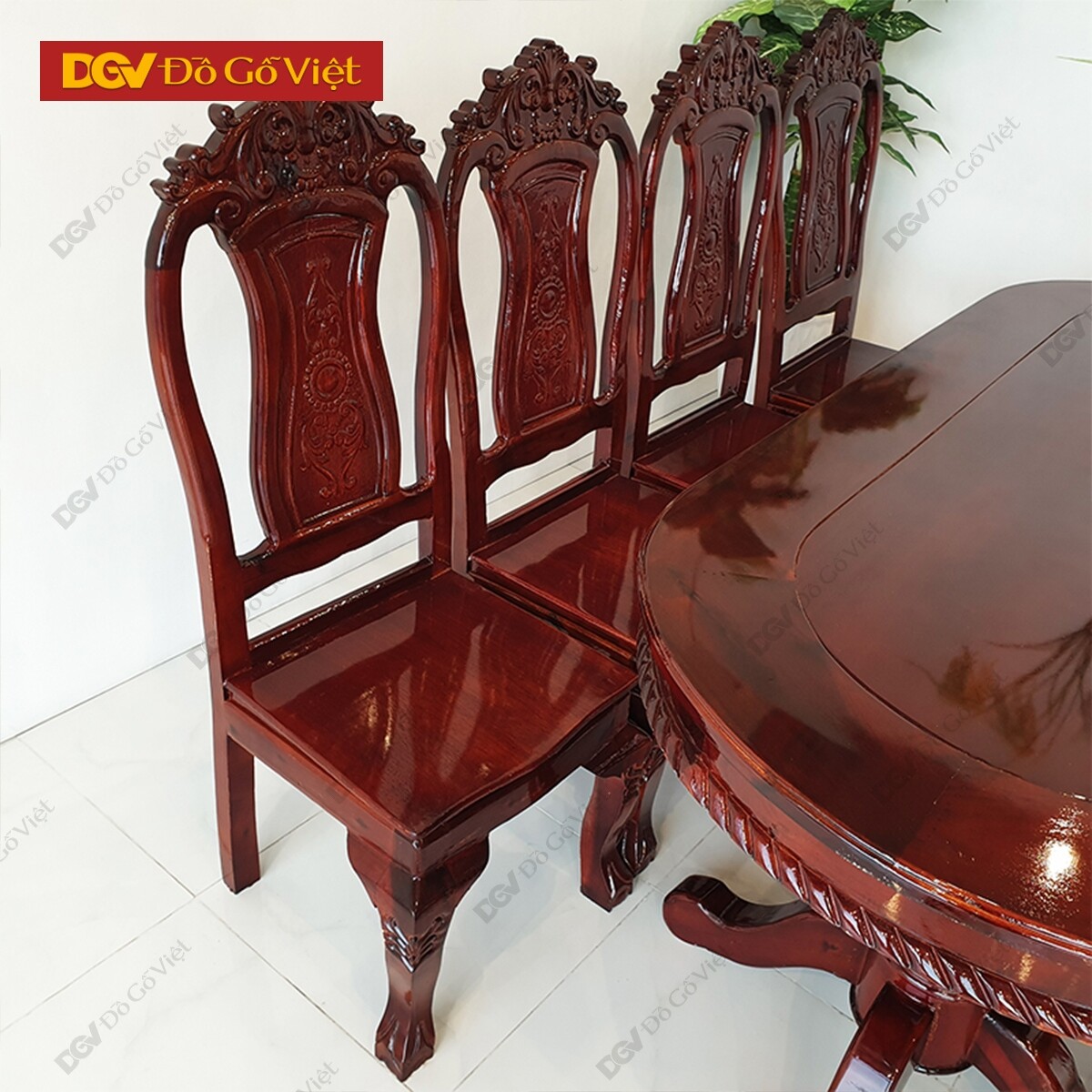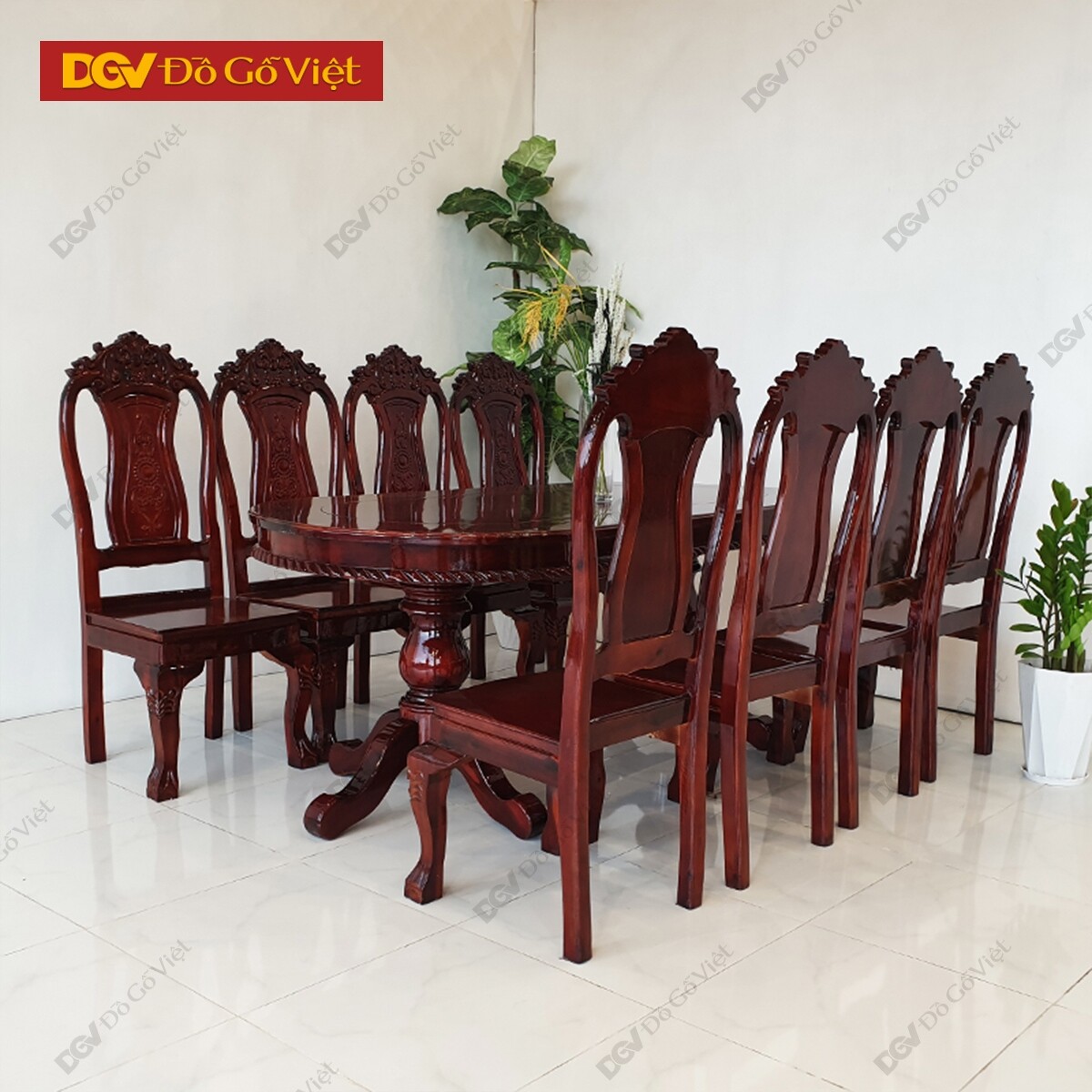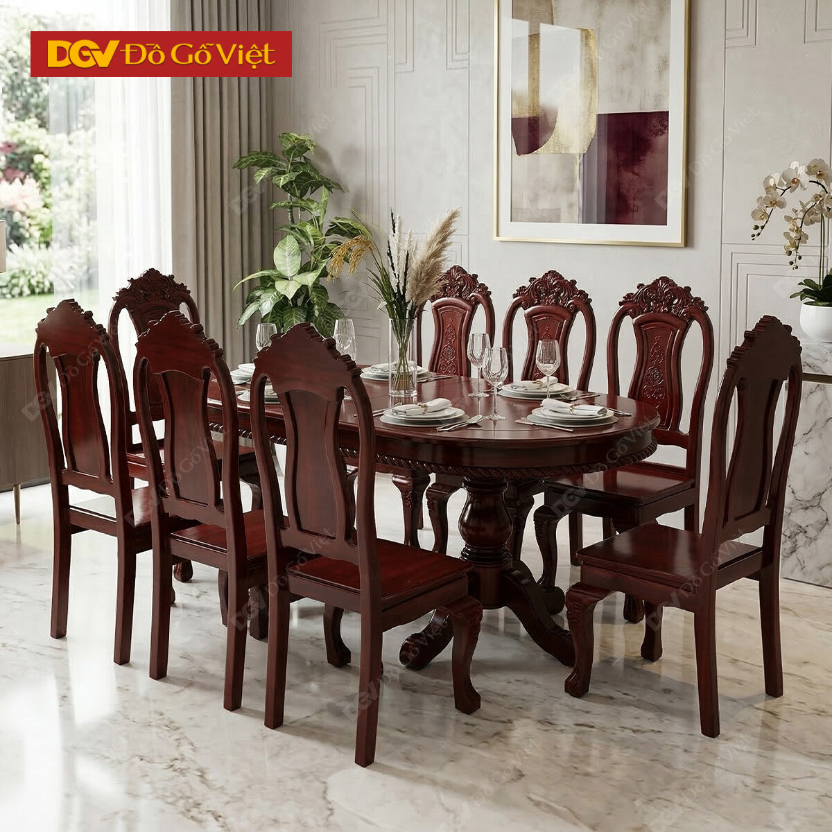 Bộ Bàn Ăn Tràm Mặt Hồng Đào Oval 8 Ghế Chạm Hoa Tây Đẹp
