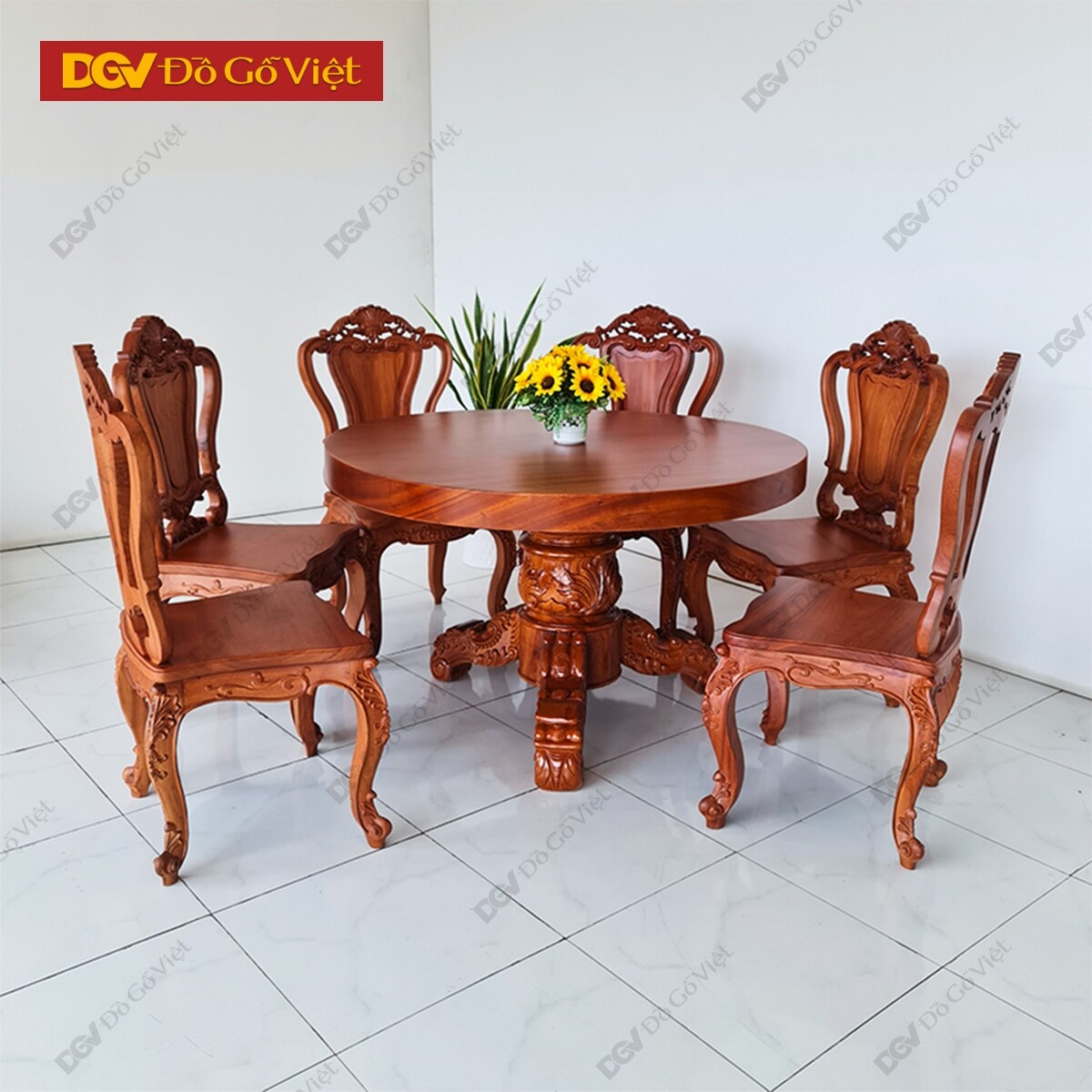 Bộ Bàn Ăn Tròn Gỗ Gõ Đỏ Nguyên Khối Chạm Hoa 6 Ghế Bền Đẹp