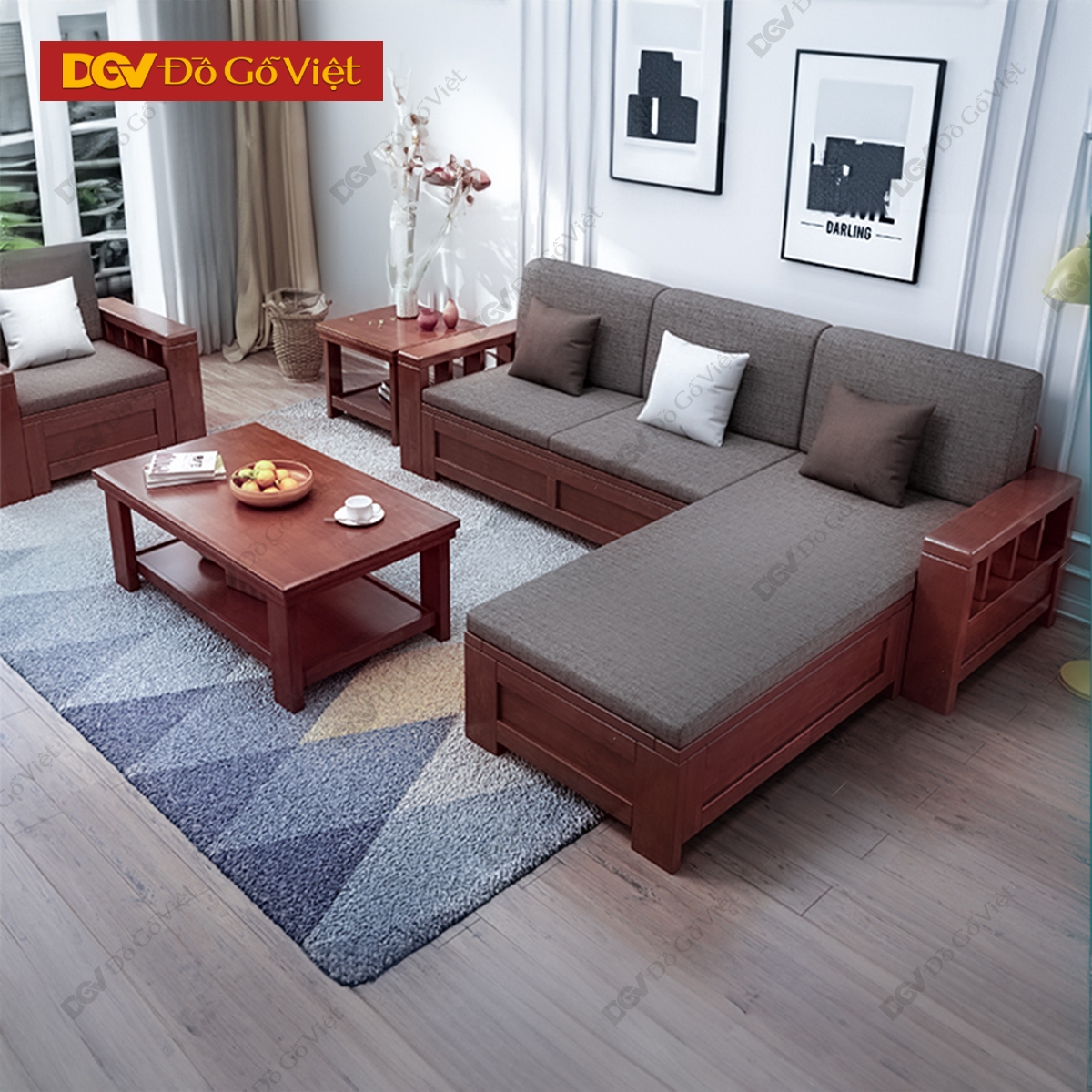 Bộ Bàn Ghế Sofa Góc Đối Gỗ Căm Xe Hiện Đại Đẹp Giá Rẻ