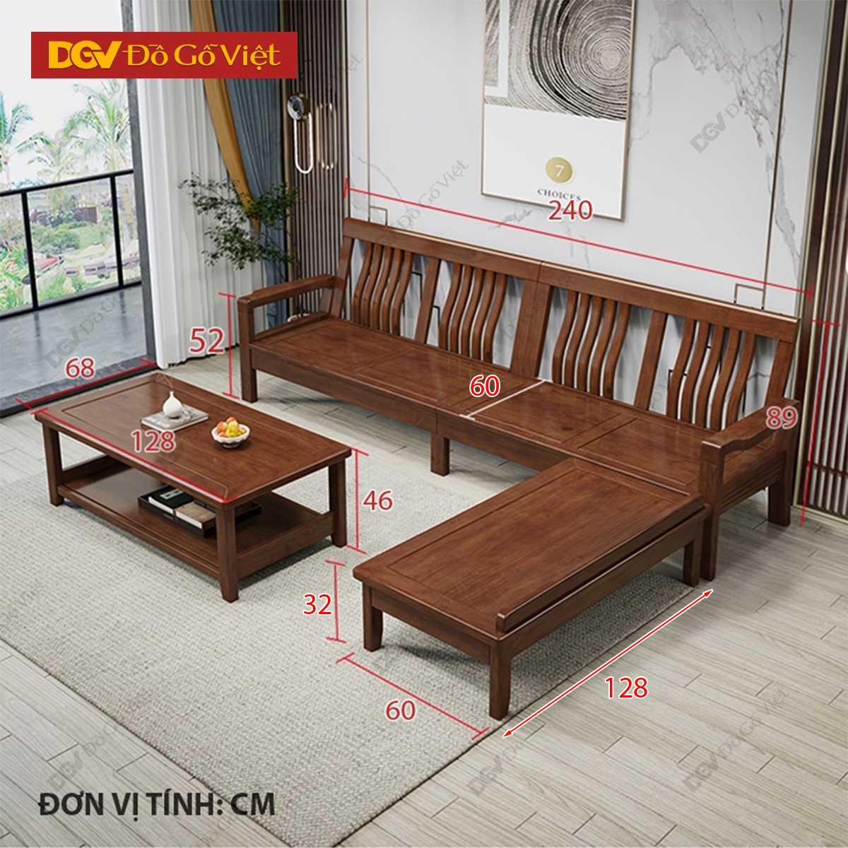 • Bàn trà: Dài 128cm x Rộng 68cm x Cao 48cm.