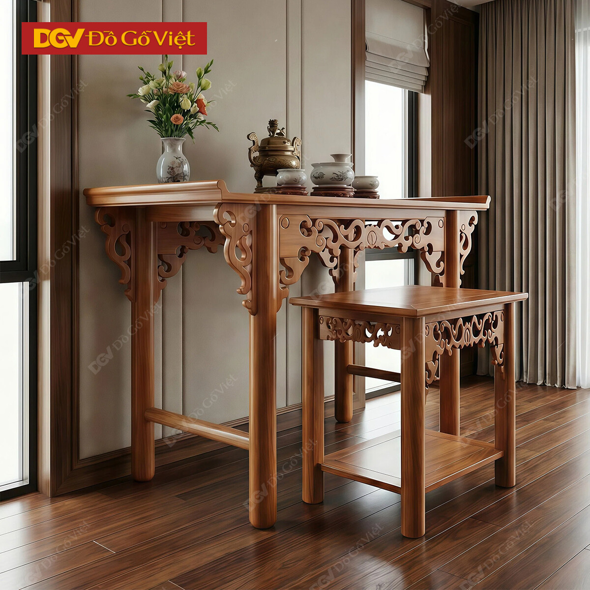 Bộ Bàn Thờ Gỗ Gõ Đỏ Phối Chân Tròn Khắc Dạ Triện Tinh Xảo
