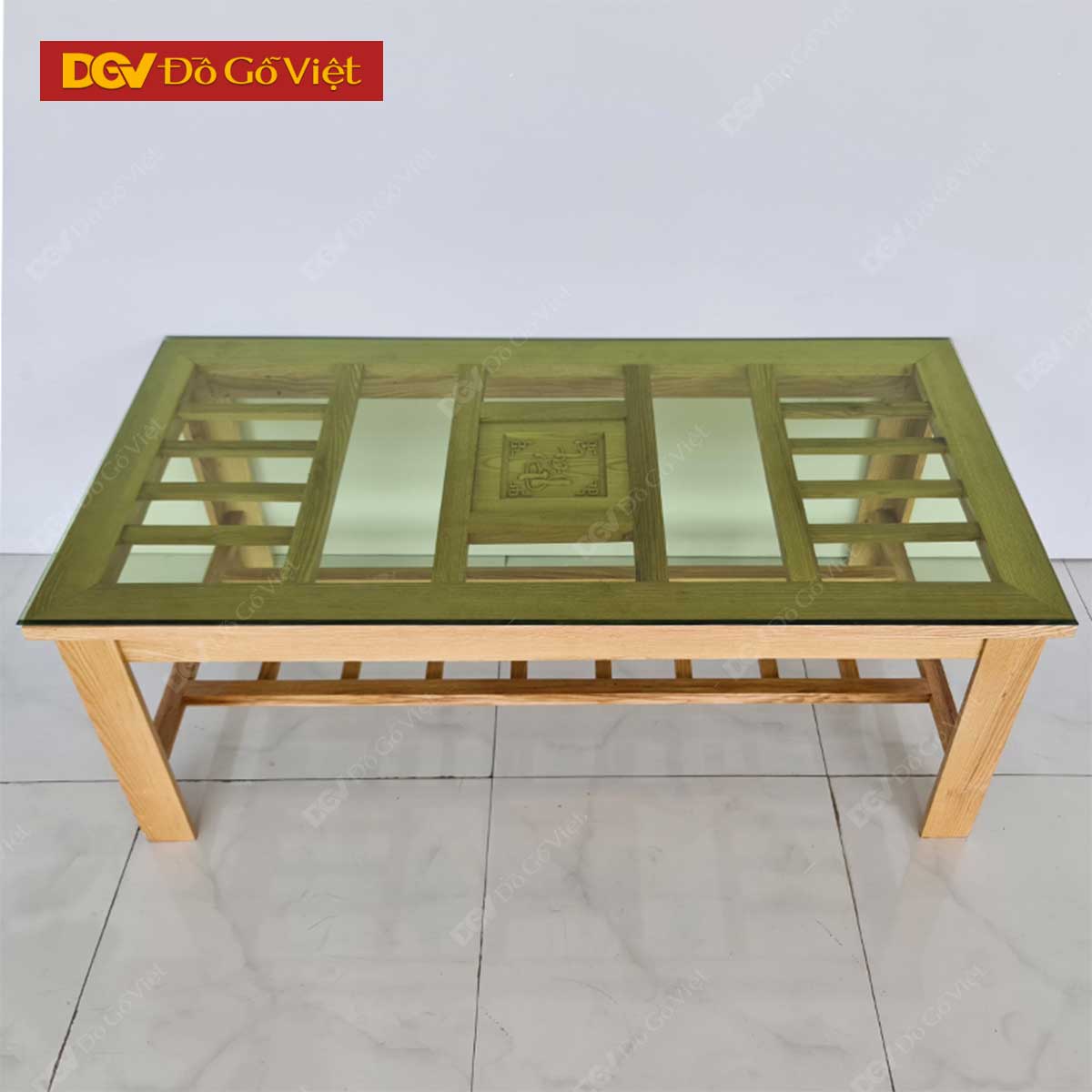 • Bàn trà loại 2 tầng với 1 ngăn dưới để đồ rộng rãi, thích hợp với những không gian hẹp, cần nhiều diện tích để sử dụng. Mặt bàn thiết kế dạng khung tranh với các nan gỗ song song độc đáo. Trung tâm mặt bàn chạm thư pháp chữ Phát Tài, là lời cầu chúc ý nghĩa thể hiện ước muốn về sự giàu sang, tài lộc.